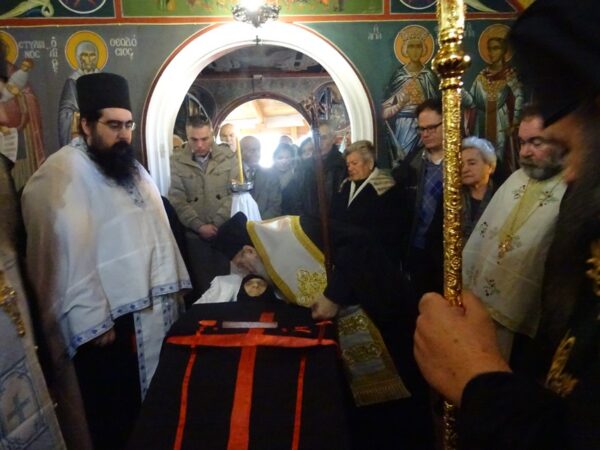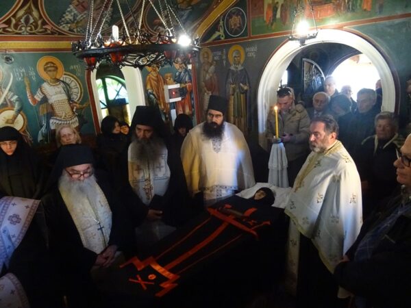Η Εξόδιος Ακολουθία εψάλη την 24ην Φεβρουαρίου 2020 στην Ι. Μονή Αγίας Μαρίνης Λουτρακίου υπό του Σεβ. Μητροπολίτου Κορίνθου κ. Διονυσίου και του Θεοφιλεστάτου Επισκόπου Κεγχρεών κ. Αγαπίου με την συμμετοχή των πατέρων της Ι. Μονής Αναστάσεως Χριστού Λουτρακίου, του Καθηγουμένου της Ι. Μονής Παναγίας «Πάντων Χαρά» Καλετζίου κ. Ανθίμου, Ιεροκήρυκος της Ι. Μητροπόλεως, των Αρχιμ. π. Μακαρίου Μπογιατζόγλου και π. Αρκαδίου Ραζνύ, του Αιδεσ. π. Δημητρίου Σουσούνη, των Διακόνων π. Δαμασκηνού Γεννηματά και π. Δημητρίου Μπαλλά, Ηγουμενισσών και αδελφών των Ιερών Μονών Οσίου Παταπίου Γερανείων Ορέων, Παναγίας Φανερωμένης Χιλιομοδίου, Αγίου Δημητρίου Καρακαλά (Αργολίδος), των Ι. Ησυχαστηρίων Τιμίου Σταυρού Μαψού, Αγίου Γερασίμου Περαχώρας και του Ι. Μετοχίου της Ιεράς Μονής «Η ΘΕΟΜΗΤΩΡ» Ηλιουπόλεως Αθηνών Προφήτου Ηλιού Λουτρακίου.