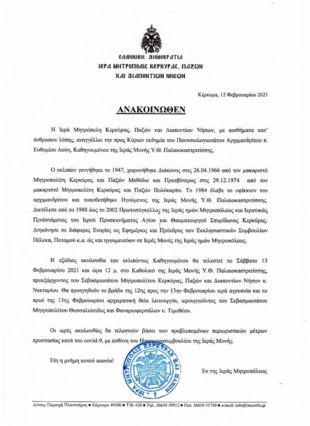 Η Ιερά Μητρόπολη Κερκύρας, Παξών και Διαποντίων Νήσων, με αισθήματα κατ’ άνθρωπον λύπης, αναγγέλλει την προς Κύριον εκδημία του Πανοσιολογιωτάτου Αρχιμανδρίτου π. Ευθυμίου Δούη, Καθηγουμένου της Ιεράς Μονής Υ.Θ. Παλαιοκαστριτίσσης.