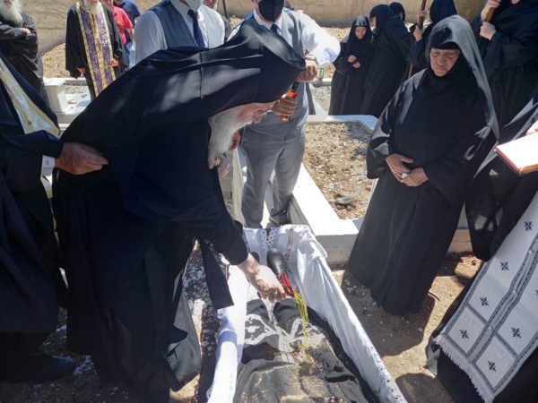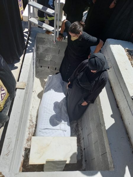 Η ταφή της έγινε αφού ετηρήθησαν όλα τα μοναχικά θέσμια στο κοιμητήριο της Ι. Μονής.