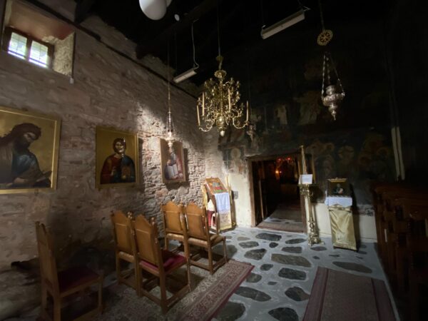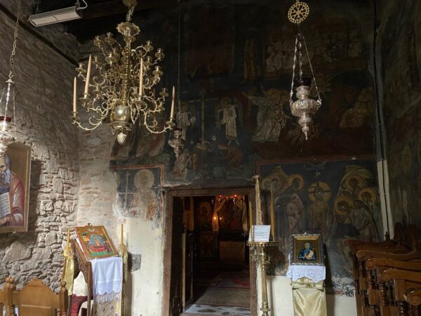 Το εσωτερικό του ναού ήταν διακοσμημένο με τοιχογραφίες για τις οποίες εργάστηκαν πέντε αγιογράφοι. Χρονολογούνται τον πρώιμο 13ο αιώνα και διατηρούνται αποσπασματικά, στο Ιερό Βήμα, στον δυτικό τοίχο του κυρίως ναού, στη λιτή, καθώς και στην εξωτερική όψη του νότιου τοίχου. Οι αγιογραφίες στην εξωτερική πλευρά του νότιου τοίχου του νάρθηκα τοποθετούνται στην περίοδο 1259-1264, χρονολόγηση που στηρίζεται στα σπαράγματα επιγραφών που συνοδεύουν δύο μορφές, τον αυτοκράτορα Μιχαήλ Η΄ τον Παλαιολόγο (1259-1282) και τον αδελφό του Ιωάννη. Αργότερα, τον 16ο αιώνα, στη νότια πλευρά του καθολικού προσαρτήθηκε και τοιχογραφήθηκε το παρεκκλήσιο του Αγίου Ιωάννη του Θεολόγου.