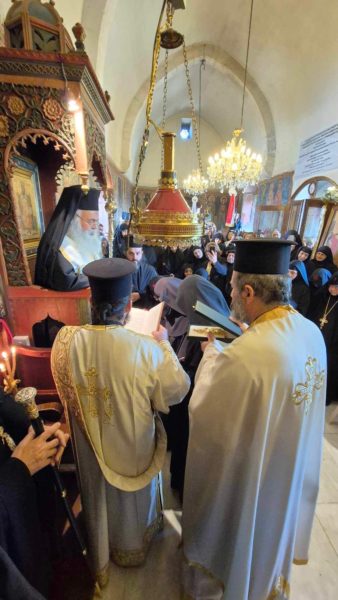 Στη Θεία Λειτουργία και στην τελετή της Ενθρονίσεως παρέστησαν ο Πανιερώτατος Μητροπολίτης Κυρηνείας κ. Χρυσόστομος, ο Σεβασμιώτατος Μητροπολίτης Βόστρων κ. Τιμόθεος, οι Ηγουμένες των Ιερών Μονών Θεοτόκου, Ευφημία μοναχή, Αγίου Ηρακλειδίου, Προδρόμη μοναχή, Αμασγούς, Επιφανία μοναχή, Αμιρούς, Εφραιμία μοναχή, Παντανάσσης, Επιφανία μοναχή, Αγίου Ιωάννου του Θεολόγου, Αρσενία μοναχή, Αγ. Θέκλης, Κωνσταντία μοναχή, Αγίου Μηνά, Μαγδαληνή μοναχή, Σαλαμιωτίσσης, Αγάθη μοναχή, η Προϊσταμένη του Ησυχαστηρίου Αγ. Τριάδος, Μαριάμ μοναχή, εκπρόσωποι των Μονών Αγίου Νεοφύτου και Αγίου Γεωργίου Μαυροβουνίου, Κληρικοί από διάφορες περιοχές, Μοναχοί και Μοναχές και πλήθος προσκυνητών.
