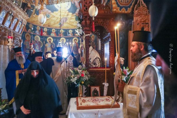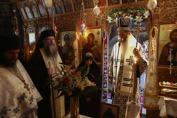 Ο Σεβασμιώτατος Μητροπολίτης Φθιώτιδος κ. Συμεών πλαισιούμενος από τον Άγιο Έξαρχο του Παναγίου Τάφου στην Ελλάδα, Αρχιμ. π. Ραφαήλ Γρίβα, τον Άγιο Πρωτοσύγκελλο της Ιεράς Μητροπόλεως και Καθηγούμενο της Ιεράς Μονής Αγίου Βλασίου Στυλίδος, Αρχιμ. του Οικουμενικού Θρόνου π. Εφραίμ Τριανταφυλλόπουλο, τους Αγίους Καθηγουμένους των Ιερών Μονών Παναγίας Αγάθωνος Αρχιμ. π. Γερμανό Γιαντσίδη και Παναγίας Αντινίτσης Αρχιμ. π. Αμβρόσιο Αναστασίου, τον Ιερομόναχο π. Λουκά Γρηγοριάτη ως εκπρόσωπο της Ιεράς Μονής Οσίου Γρηγορίου του Αγίου Όρους, τις Καθηγούμενες: των Ιερών Μονών Οσίου Γερασίμου Μακρινίτσας Γερόντισσα Ευπραξία, Παναγίας Δαμάστας Γερόντισσα Ιωάννα, Κοιμήσεως της Θεοτόκου Παρνασσού, Γερόντισσα Ελισάβετ, Αγίας Παρασκευής Σπαρτιάς Γερόντισσα Χριστονύμφη, Αγίου Αθανασίου Ομβριακής Γερόντισσα Μακαρία, Προφήτου Ηλιού Παλαιοχωρίου Προεστώσας Καικιλίας Μοναχής, καθώς και αντιπροσωπειών μοναζουσών από την Ιερά Μονή Αγίου Νεκταρίου Αίγινας, από την Ιερά Μονή Κοιμήσεως Θεοτόκου Πανοράματος Θεσσαλονίκης και άλλων Ιερών Μονών, από την Μητρόπολη Φθιώτιδος και από άλλα μέρη της πατρίδος μας, Αγίων Πατέρων εκ της Ιεράς Μητροπόλεως Φθιώτιδος, του Προϊσταμένου του Ιερού Μητροπολιτικού Ναού Αγίου Νικολάου Βόλου Πρωτ. π. Χαριλάου Παπαγεωργίου, συμπροσευχομένου του Αρχιμ. π. Μαξίμου Αναστόπουλου και πολλών πιστών από την ευρύτερη περιοχή και από άλλα μέρη της Ελλάδος, τέλεσε Αρχιερατική Θεία Λειτουργία στο Καθολικό της Μονής, στην οποία έψαλλε Βυζαντινός χορός Πατέρων και Ιεροψαλτών υπό τον Διευθυντή του Ωδείου της Ιεράς Μητροπόλεως «ΓΕΡΜΑΝΟΣ ο ΜΕΛΩΔΟΣ» Δρ. κ. Ανδρέα Ιωακείμ.