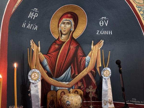 Πανηγύρισε σήμερα, Κυριακή 31 Αυγούστου 2025, το ιερό παρεκκλήσιο της Αγίας Ζώνης, που συναντά ο προσκυνητής πάνω στον κεντρικό δρόμο, λίγο πριν την άφιξή του στην Ιερά Μονή. Την πανηγυρική θεία Λειτουργία τέλεσε ο Σεβασμιώτατος Μητροπολίτης Ελασσώνος κ. Χαρίτων, συνεπικουρούμενος από τον Καθηγούμενο π. Νικάνορα και τους Πατέρες της Ιεράς Μονής. Πλήθος κόσμου κατέκλυσαν το ευλογημένο παρεκκλήσιο για να συμμετέχουν στον εορτασμό και να γευθούν τη Χάρη της Αγίας Ζώνης της Παναγίας μας.