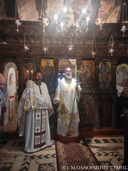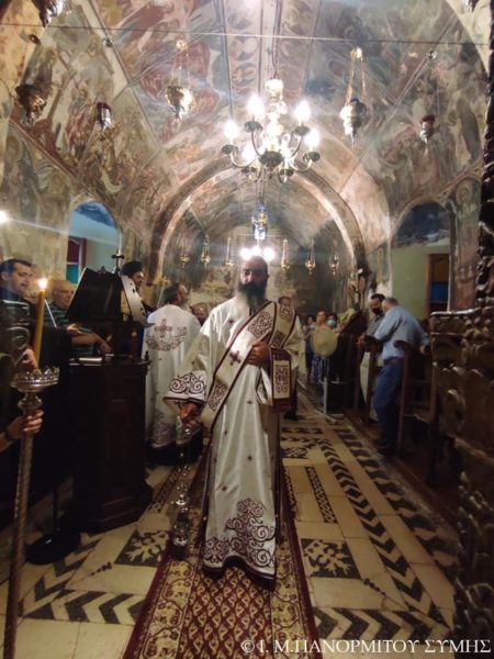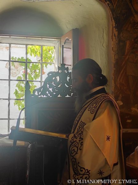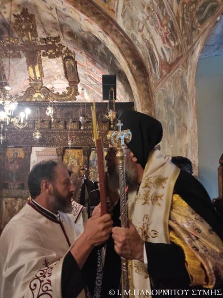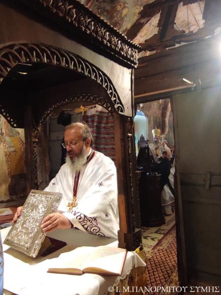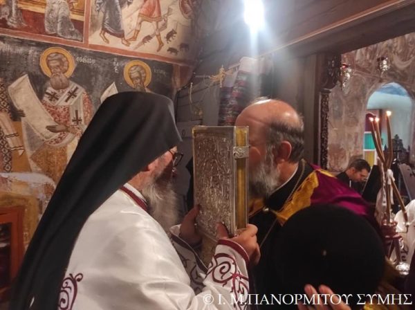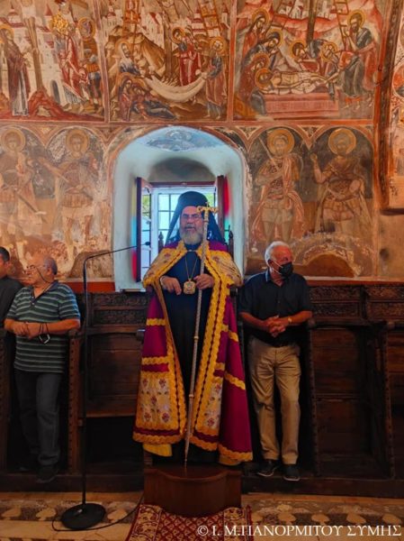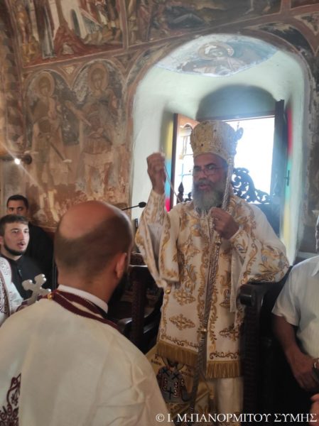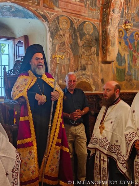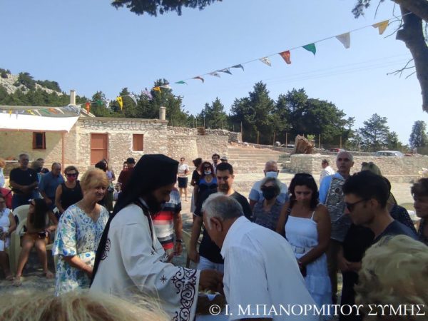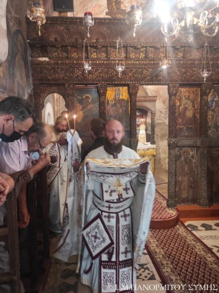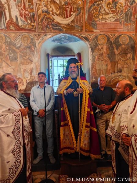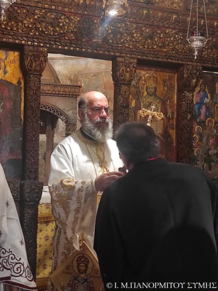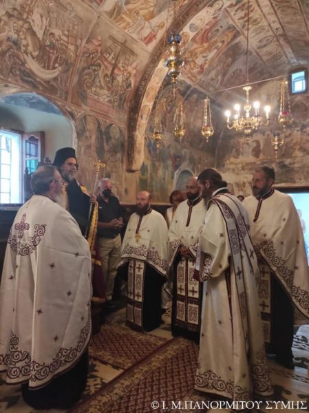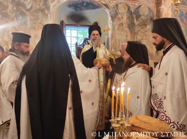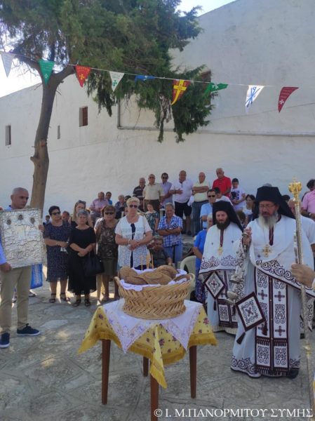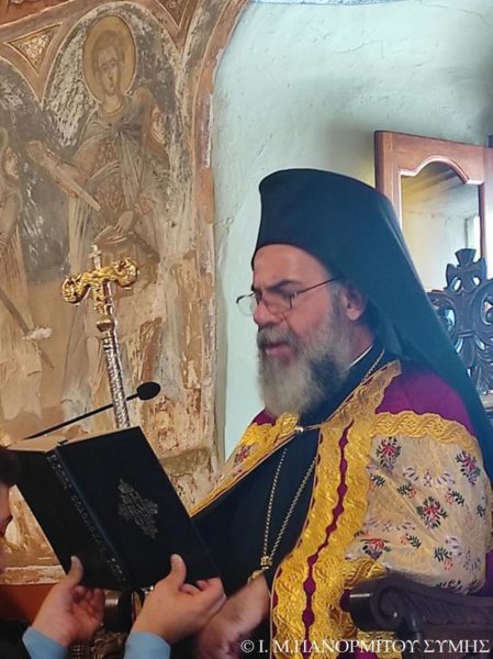 Κατά το έθος της Εκκλησίας μας, ο Σεβασμιώτατος ευλόγησε τους νέους καρπούς της αμπέλου κατά την εκκλησιαστική παράδοση της ημέρας και απηύθυνε λόγο εόρτιο. Εν τω τέλει δε προεχείρησε εις Αρχιμανδρίτην τον Ιερομόναχο π. Ανδρέα Δημητρίου, κληρικό της Ιεράς Μητροπόλεως Σύμης, προσφωνήσας αυτόν καταλλήλως. Αργότερα αφού προσεφέρθη ο παραδοσιακός καφές, διενεμήθη στους πολυπληθείς προσκυνητές ατομική συσκευασία γεύματος ιχθύων, συμφώνως προς τις Κανονικές διατάξεις της Εκκλησίας μας.