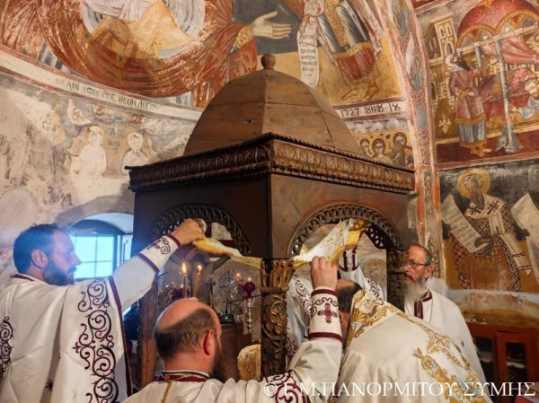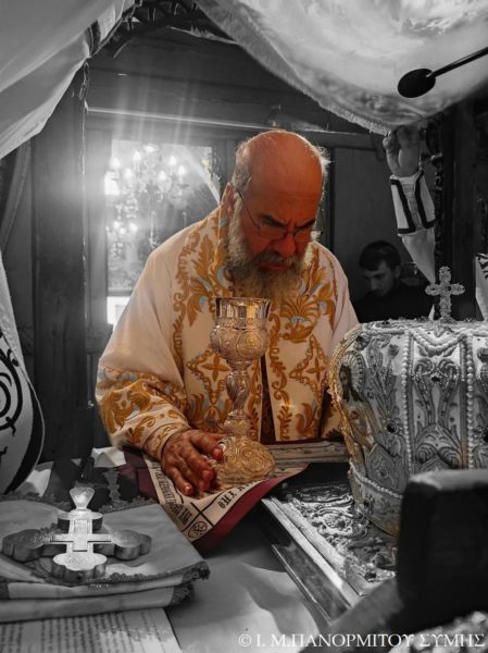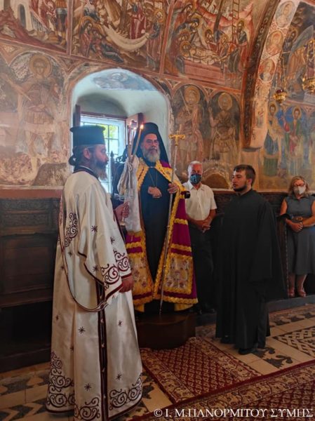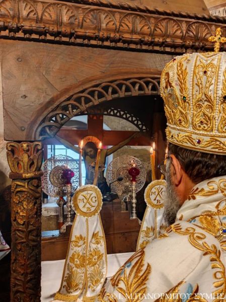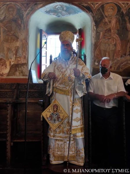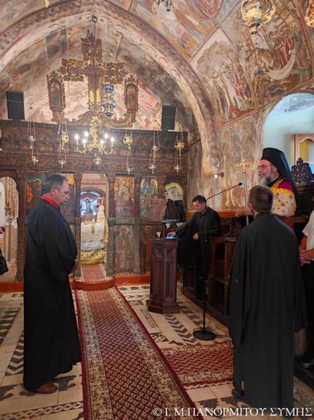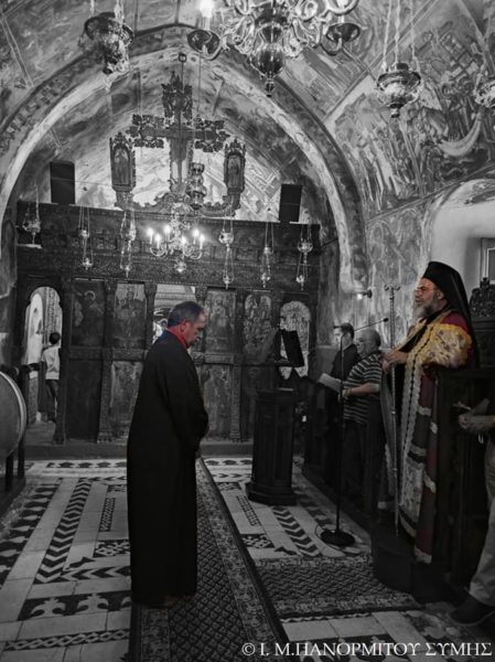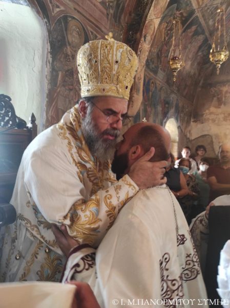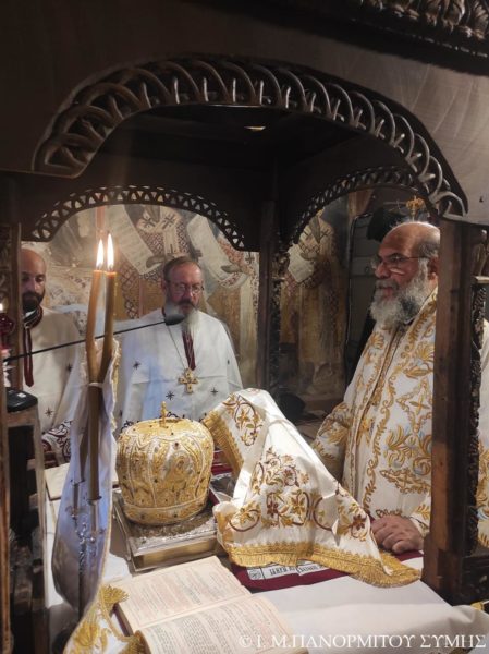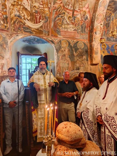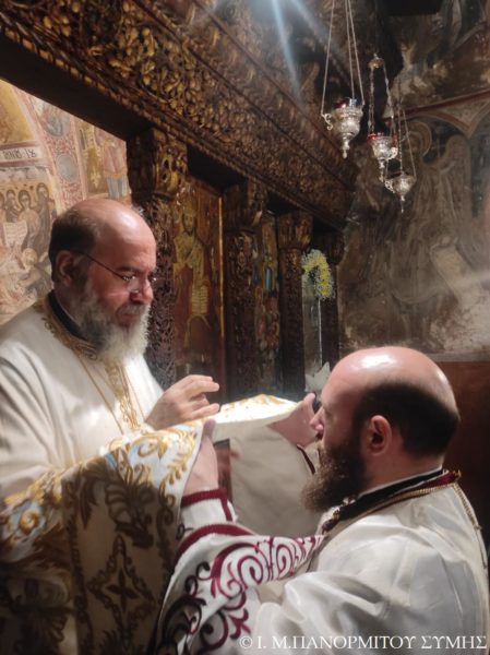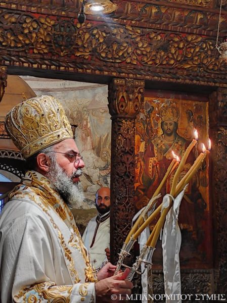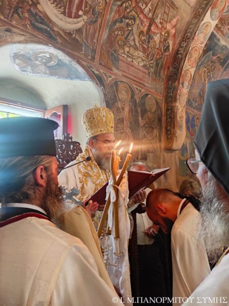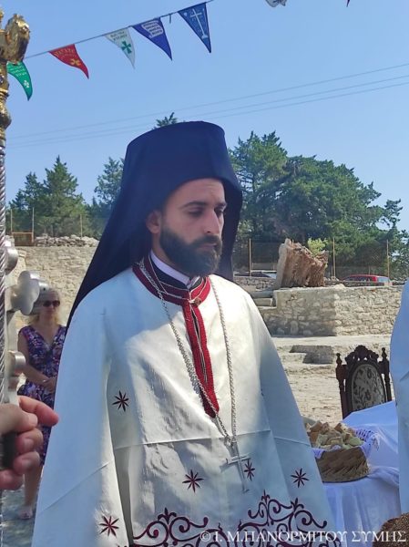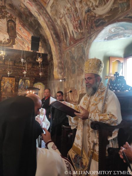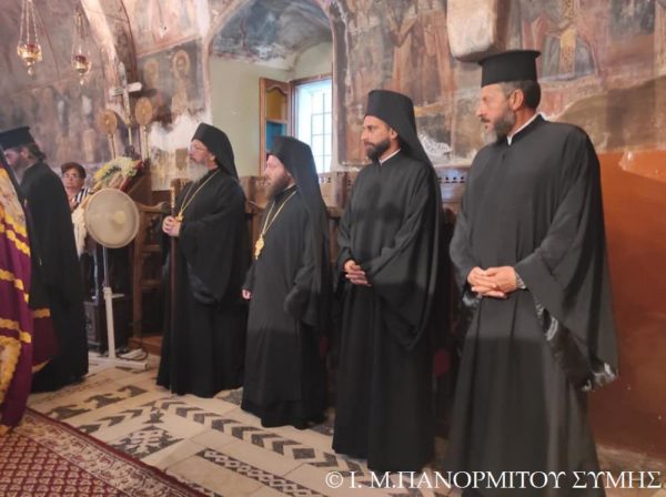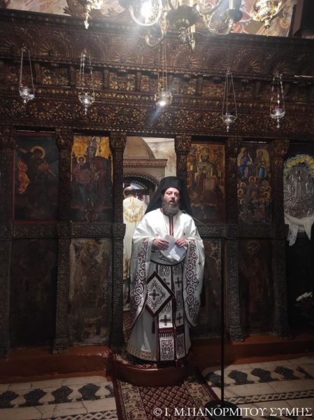 Κατά το έθος της Εκκλησίας μας, ο Σεβασμιώτατος ευλόγησε τους νέους καρπούς της αμπέλου κατά την εκκλησιαστική παράδοση της ημέρας και απηύθυνε λόγο εόρτιο. Εν τω τέλει δε προεχείρησε εις Αρχιμανδρίτην τον Ιερομόναχο π. Ανδρέα Δημητρίου, κληρικό της Ιεράς Μητροπόλεως Σύμης, προσφωνήσας αυτόν καταλλήλως. Αργότερα αφού προσεφέρθη ο παραδοσιακός καφές, διενεμήθη στους πολυπληθείς προσκυνητές ατομική συσκευασία γεύματος ιχθύων, συμφώνως προς τις Κανονικές διατάξεις της Εκκλησίας μας.