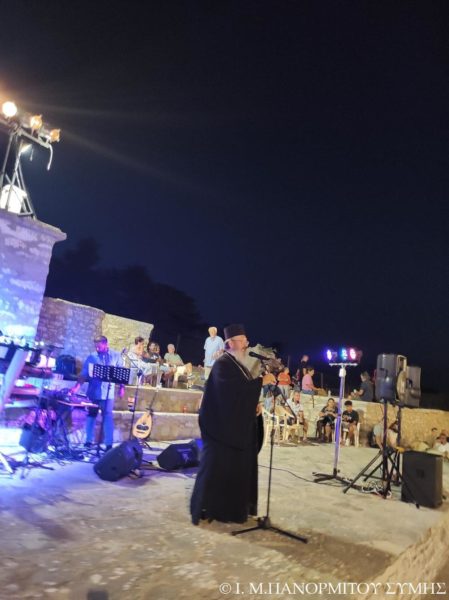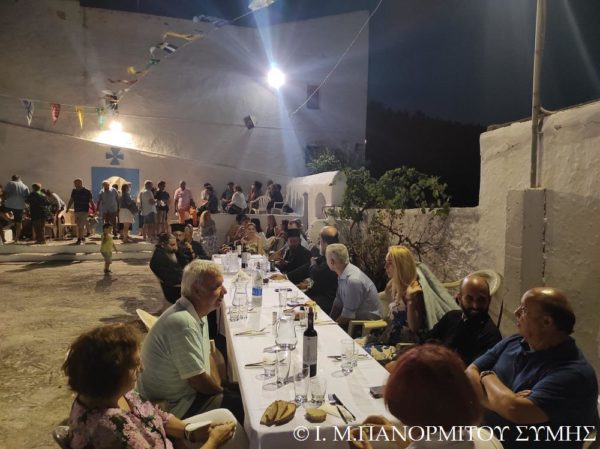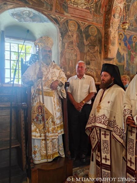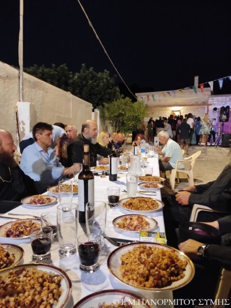 Το δε ιερό αναλόγιο διακόνησαν γλυκυφθόγγως οι Ιεροψάλτες, κ. Μερκούριος Γιανναράς και κ. Αγαπητός Μιχελλής. Προ της απολύσεως ο Σεβασμιώτατος με τον εμβριθή θεολογικό του λόγο, μύησε τους πιστούς στα υψηλά νοήματα της μεγάλης αυτής Δεσποτικής εορτής της Μεταμορφώσεως, επισημαίνοντας τις εντός της Εκκλησίας μας προσφερόμενες δυνατότητες για εσωτερική μεταμόρφωση και μετοχή στο Θαβώριο Φως. Στη συνέχεια ακολούθησε το παραδοσιακό πανηγύρι με την ορχήστρα του Μιχαήλ Μισού, και προσφέρθηκε εορταστική τράπεζα νηστήσιμων έδεσμάτων. Στον Εσπερινό συμμετείχαν ο Δήμαρχος Σύμης κ. Ελευθέριος Παπακαλοδούκας, ο Στρατιωτικός Διοικητής Δ.Α.Ν. Σύμης Σχης (ΠΖ) κ. Παν. Βρανάς και ο Αντιδήμαρχος κ. Νικήτας Γρύλης.