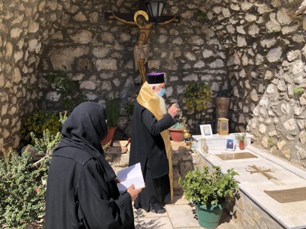 Επίσης, το Σάββατο 10 Απριλίου ο Σεβασμιώτατος επισκέφθηκε την Ιερά Μονή Αγίου Νικολάου Υψηλάντη, όπου και τέλεσε τρισάγιο στον τάφο της μακαριστής Καθηγουμένης Θεοφυλάκτης και στον τάφο της μακαριστής μοναχής Μακαρίας.