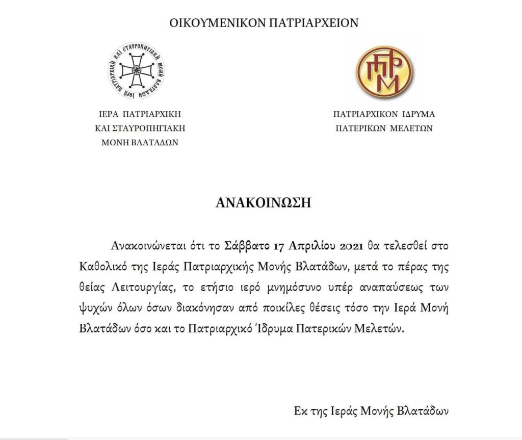 Ετήσιο ιερό μνημόσυνο υπέρ αναπαύσεως των ψυχών όσων διακόνησαν από διάφορες θέσεις τόσο την Ιερά Πατριαρχική Μονή Βλατάδων όσο και το Πατριαρχικό Ίδρυμα Πατερικών Μελετών θα τελεστεί το ερχόμενο Σάββατο 17 Απριλίου 2021.