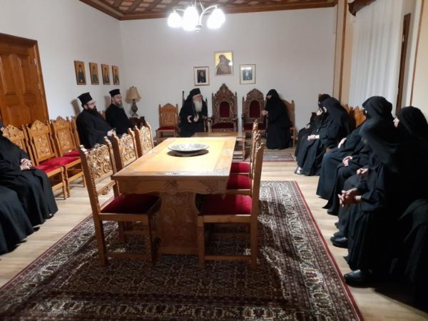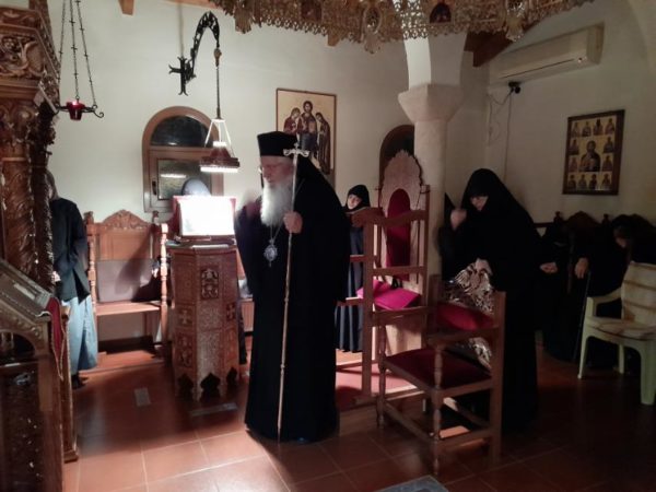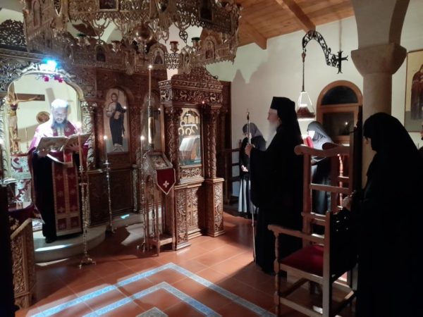 Στο τέλος της Ακολουθίας ο Σεβασμιώτατος ευχήθηκε στην οσιολογιωτάτη Γερόντισσα Ευπραξία και τις αδελφές της Ιεράς Μονής με την ευκαιρία της εορτής των Χριστουγέννων.