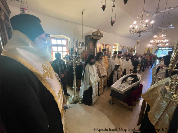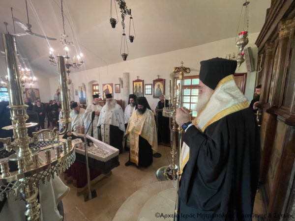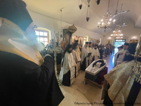 Και κατέληξε: «Πορεύου εν ειρήνη την αγαθήν πορείαν την άγουσαν εις την αληθή και άληκτον ζωήν. Αναπαύου εν Κυρίω, μετά Αγίων και Δικαίων και προσεύχου και υπέρ ημών να αγωνιζόμαστε να «μορφωθή Χριστός εν υμίν» (Γαλ. 4,19) και να βαδίζουμε τον δρόμο της μετανοίας που οδηγεί στην βασιλεία των ουρανών. Θα αναπαυθείς δίπλα στις άλλες μονάζουσες της Μονής, την κατά σάρκα αδελφή σου Θεοδοσία, τις αγαπημένες σου Νεκταρία, Θέκλα, Φιλοθέη, Παρασκευή και Θεοπίστη, που αναπαύονται στον αυλόγυρο του ιερού αυτού χώρου. Είμαστε βέβαιοι ότι από τις ουράνιες μονές που βρίσκεσθε θα συνεχίσετε όλες να δέεσθε προς πάντας τους Αγίους για τον επιστηριγμό και την σωτηρία της Αδελφότητας και των ευσεβών προσκυνητών της Ιεράς αυτής Μάνδρας. Ιδιαιτέρως στον άγνωστο μεν τοις ανθρώποις, γνωστό δε και επώνυμο τω Θεώ Άγιο, που είναι ενταφιασμένος στη νοτιοδυτική πλευρά του Καθολικού της Μονής, γνωστός με την επωνυμία «Αγιασμένος», καθώς ο Θεός θέλησε να μείνει άγνωστο σε εμάς το κοσμικό όνομά του… Ο Αρχηγός της ζωής και του θανάτου, ο εκ νεκρών Αναστάς Κύριος μας Ιησούς Χριστός, να αναπαύσει την μακαρία ψυχή σου εν Χώρα ζώντων μετά των Δικαίων και των Αγίων».