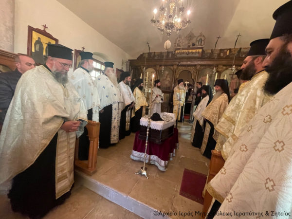 Σε κλίμα συγκίνησης και κατάνυξης τελέστηκε χθες η Εξόδιος Ακολουθία της μακαριστής Μελετίας Μοναχής, κατά κόσμον Αρετής Μπλαζάκη, στο κατάμεστο από πιστούς Καθολικό της Ιεράς Μονής Αγίων Πάντων Αγιασμένου Ιεράπετρας, προεξάρχοντος του Μητροπολίτη Ιεραπύτνης και Σητείας κ. Κυρίλλου, ο οποίος και εκφώνησε τον επικήδειο λόγο.