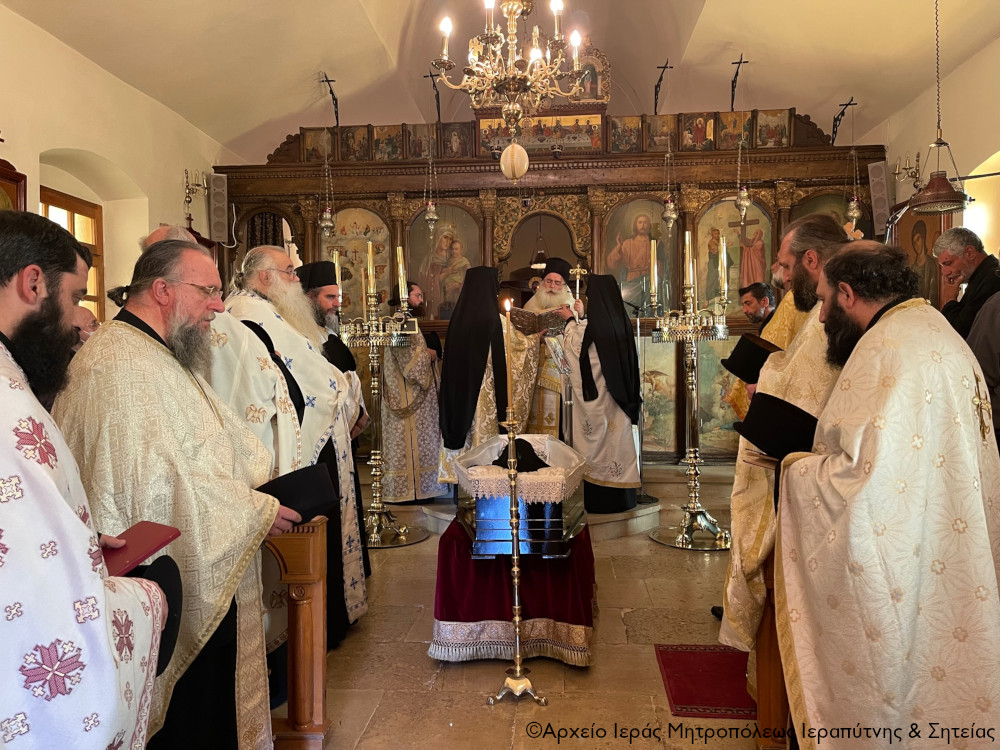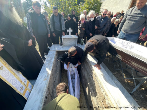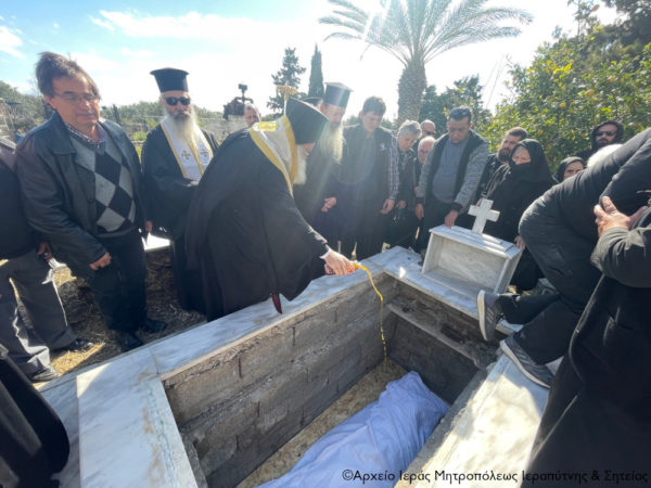 Ακολούθησε ο ενταφιασμός της κεκοιμημένης μοναχής Μελετίας στον αύλειο χώρο της Μονής από τον Σεβασμιώτατο Μητροπολίτη Ιεραπύτνης και Σητείας κ. Κύριλλο.