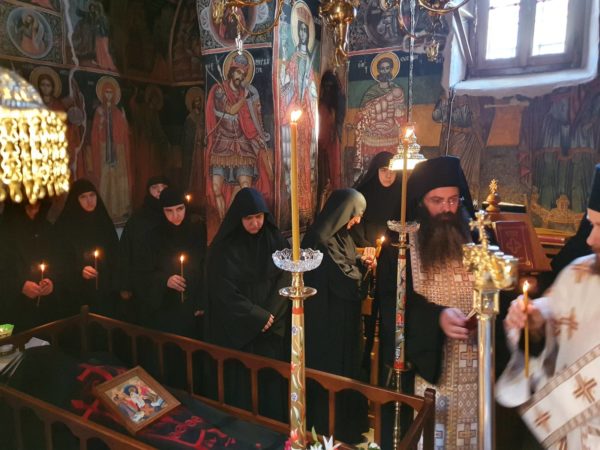 Την εξόδιο ακολουθία τέλεσε ο Σεβασμιώτατος Μητροπολίτης Σταγών και Μετεώρων κ. Θεόκλητος ο οποίος στον επικήδειο λόγο του αναφέρθηκε στο πρόσωπο της μακαριστής αδελφής, στο φιλακόλουθο, εργατικό και άοκνο πνεύμα της και στην ευρύτερη διακονία και προσφορά της στην Ιερά Μονή.