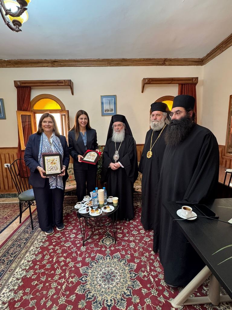Επί πλέον, ο Μακαριώτατος είχε συνάντηση με τον Πρωθυπουργό της Ελληνικής Δημοκρατίας κ. Κυριακό Μητσοτάκη, με τον οποίο είχε θερμή και γόνιμη συνομιλία περί ζητημάτων που αφορούν το Πατριαρχείο Ιεροσολύμω και την εν γένει κατάσταση της Μέσης Ανατολής. Ο Μακαριώτατος είχε συνάντηση επίσης με την κ. Αλεξάνδρα Παπαδοπούλου, Υφυπουργό Εξωτερικών, με την κ. Σοφία Ζαχαράκη, Υπουργό Παιδείας, Θρησκευμάτων και Αθλητισμού και με τον κ. Γεώργιο Καλαντζή, Γενικό Γραμματέα Θρησκευμάτων για θέματα που αφορούν την πνευματική, πολιτιστική, φιλανθρωπική και εθνική αποστολή του Πατριαρχείου Ιεροσολύμων.