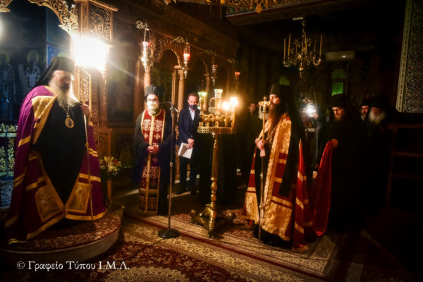 Προσφωνώντας με θερμούς λόγους ο Σεβασμιώτατος τον ενθρονισθέντα αφού αναφέρθηκε στην μακραίωνη ιστορία του Μοναχισμού και στην συμβολή του στην Ορθοδοξία και στον Ελληνικό πολιτισμό, έκανε λόγο περί του προσώπου του νέου Ηγουμένου, ο οποίος αποτελεί τέκνο υπακοής του Ιερού Ησυχαστηρίου και γνώστης των πνευματικών αναγκών των αδελφών του, προτρέποντας τον, να ασκεί τα υψηλά καθήκοντα του με ζήλο και αυτοθυσιαστική προσφορά προς τους συμμοναστούς του και προς τους προσκυνητές οι οποίοι αναζητούν πνευματική όαση και παρηγοριά σε αυτό, ενώ καταλήγοντας τον ευχήθηκε η διακονία του αυτή να είναι πολύκαρπος, συνεχίζοντας παρόλο τους δύσκολους καιρούς που διερχόμαστε, το πλούσιο και πολυσχιδές πνευματικό έργο του Γέροντος του π. Κυρίλλου.
