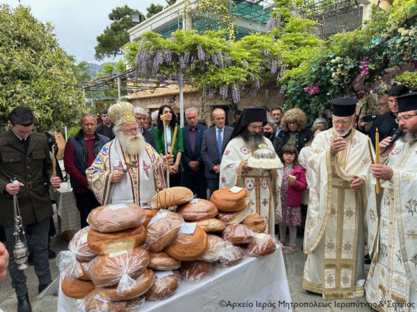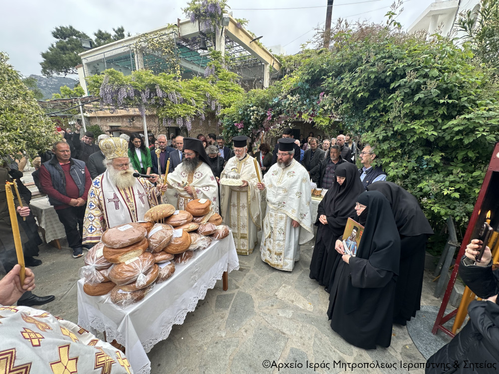 Πριν την απόλυση της Αρχιερατικής Θ. Λειτουργίας πραγματοποιήθηκε η ευλόγηση των άρτων στον αύλειο χώρο μπροστά από το Καθολικό της Μονής με την παρουσία του Ιερού Λειψάνου και της εικόνος του Οσίου.