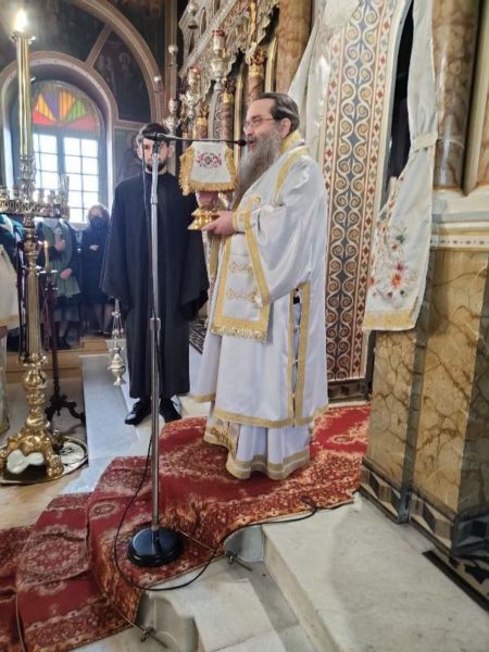 Ο Σεβασμιώτατος κήρυξε εμπνευσμένα τον Θείο λόγο, λαμβάνοντας αφορμή από τα τροπάρια των Αίνων της εορτής, και συγκεκριμένα την φράση «άνθρωπε επουράνιε, επίγειε άγγελε…», η οποία απευθύνεται στον Άγιο. Τόνισε ότι ο άνθρωπος δημιουργήθηκε από τον Θεό για να γίνει «θεός κατά χάριν» και αυτό αποτελεί τον μεταφυσικό προσανατολισμό του που καθορίζει την σχέση Θεού και ανθρώπου μέσα στον χρόνο. Αυτόν τον αγώνα διεξάγει κάθε Χριστιανός – και δη ο μοναχός. Αυτό πέτυχε ο μακάριος κτίτωρ, ο Άγιος Άνθιμος, ο οποίος εξαγιασθείς κατέλιπε την Ιερά Μονή και το σκήνωμα του πλουτισμό και θησαυρό ανεκτίμητον στην Ιερά Μητρόπολη.