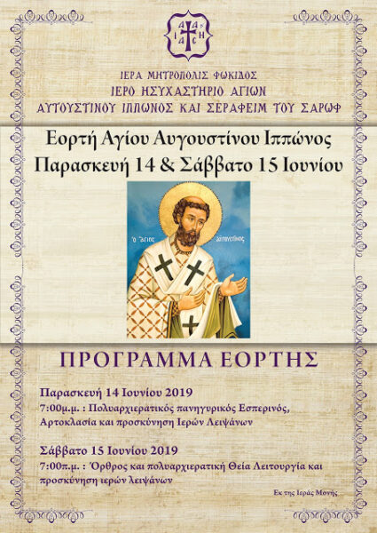 Στις 14 και 15 Ιουνίου 2019, η Ιερά Μονή ΑΓΙΟΥ ΑΥΓΟΥΣΤΙΝΟΥ ΙΠΠΩΝΟΣ ΚΑΙ ΣΕΡΑΦΕΙΜ ΤΟΥ ΣΑΡΩΦ της Ιεράς Μητροπόλεως Φωκίδος πανηγυρίζει τον Άγιο Αυγουστίνο και την μητέρα του Αγία Μόνικα στο Τρίκορφο Φωκίδος, κατά το ακόλουθο πρόγραμμα: