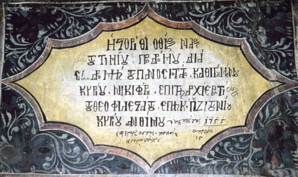“ΑΝΕΣΤΟΡΗΘΗ Ο ΘΟΙΟΣ ΚΑΙ ΠΑΝΣΕΠΤΟΣ ΝΑΟΣ ΟΥΤΟΣ ΤΗΣ ΑΓΙΑΣ ΜΑΤΑΜΟΡΦΩΣΕΩΣ ΤΟΥ ΚΥΡΙΟΥ ΚΑΙ ΘΕΟΥ ΚΑΙ ΣΩΤΗΡΟΣ ΗΜΩΝ ΙΗΣΟΥ ΧΡΙΣΤΟΥ ΑΡΧΕΡΑΤΕΒΩΝΤΟΣ ΤΟΥ ΘΕΟΦΙΛΕΣΤΑΤΟΥ ΕΠΗΣΚΟΠΟΥ ΚΗΡΙΟΥ ΚΗΡ ΑΝΘΙΜΟΥ ΚΑΙ ΗΓΟΥΜΕΝΕΒΩΝΤΟΣ ΗΕΡΕΜΙΟΥ ΙΕΡΟΜΟΝΑΧΟΥ Κ ΔΙΑ ΣΥΝΔΡΟΜΗΣ ΚΑΙ ΕΞΟΔΟΥ ΚΩΝΣΤΑΝΤΗ ΚΑΙ ΝΙΚΟΛΑ Φ.Λ. ΜΑΙΩΝ ΚΑΙ ΑΝΑΓΝΩΣΤΟΥ ΤΗΣ ΜΟΡΦΩΣ. ΕΤΟΣ 1752 Οκτώβριος”.
