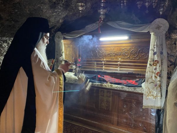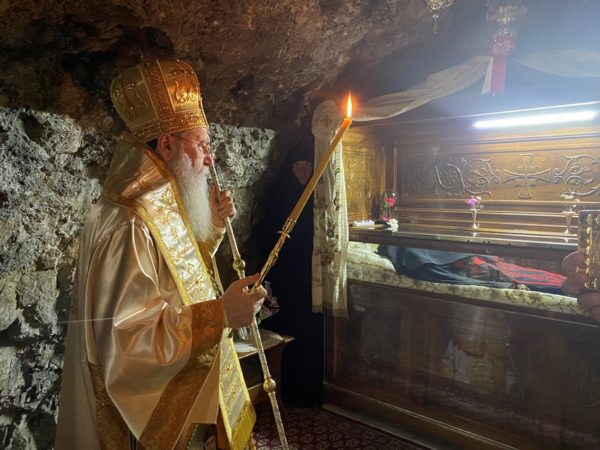 Ακολούθως, ο Ποιμενάρχης αναφέρθηκε στο ιστορικό της Ευρέσεως του Ι. Σκηνώματος το έτος 1904, καθώς και στην σύσταση της ομώνυμης Ι. Μονής το 1952. Επεσήμανε ότι ο Όσιος Πατάπιος συνδέθηκε με θαυματουργικές θεραπείες της υδρωπικίας και του καρκίνου επιτελώντας και πολλά άλλα θαύματα στο Όνομα του Ιησού Χριστού κατά το Ευαγγελικό: «ἐν τῷ ὀνόματί μου δαιμόνια ἐκβαλοῦσι· γλώσσαις λαλήσουσι καιναῖς· ὄφεις ἀροῦσι· κἂν θανάσιμόν τι πίωσιν, οὐ μὴ αὐτοὺς βλάψει· ἐπὶ ἀρρώστους χεῖρας ἐπιθήσουσι, καὶ καλῶς ἕξουσιν» (Μαρκ. Ιστ’, 17-18). Τέλος, δεόμενος προς τον Όσιο Πατάπιο ανέπεμψε την ευχή να πρεσβεύει υπέρ ημών και δια της Αναστάσεως να μας σώσει!