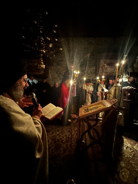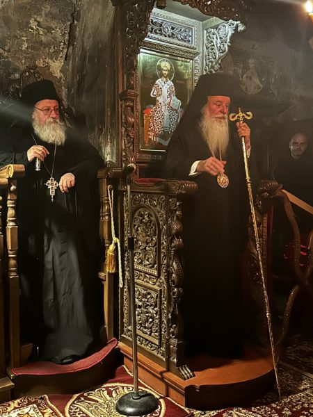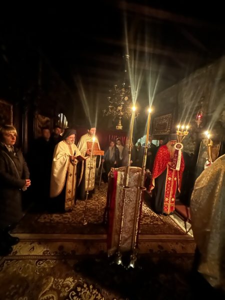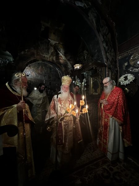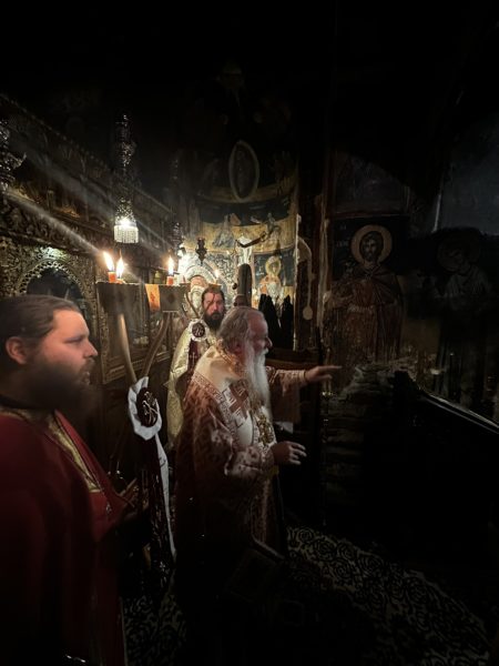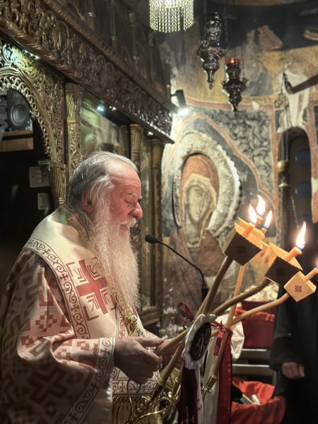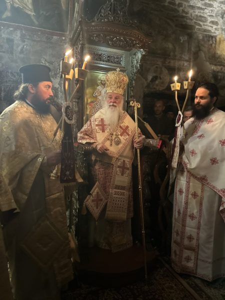 Στην αγρυπνία χοροστάτησε ο Σεβασμιώτατος Μητροπολίτης Αυλώνος κ. Χριστόδουλος και προεξήρχε της Θείας Λειτουργίας, συμπαραστατούμενος υπό του Καθηγουμένου της Μονής Αρχιμανδρίτου Αρσενίου Μάιπα, του Αρχιμανδρίτου Μαξίμου Παναγιώτου, των πατέρων της Μονής αλλά και ιερέων της τοπικής Μητροπόλεως.