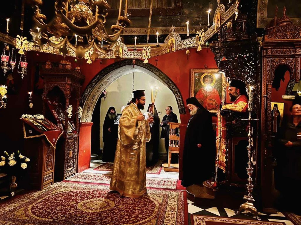 Στις 7 το απόγευμα ξεκίνησε η πανηγυρική και πολύωρη ιερά Αγρυπνία. Στην ιερά αγρυπνία ο Σεβασμιώτατος χοροστάτησε ενώ τέλεσε την ακολουθία της λιτής και της αρτοκλασίας κατά το μοναστηριακό τυπικό.