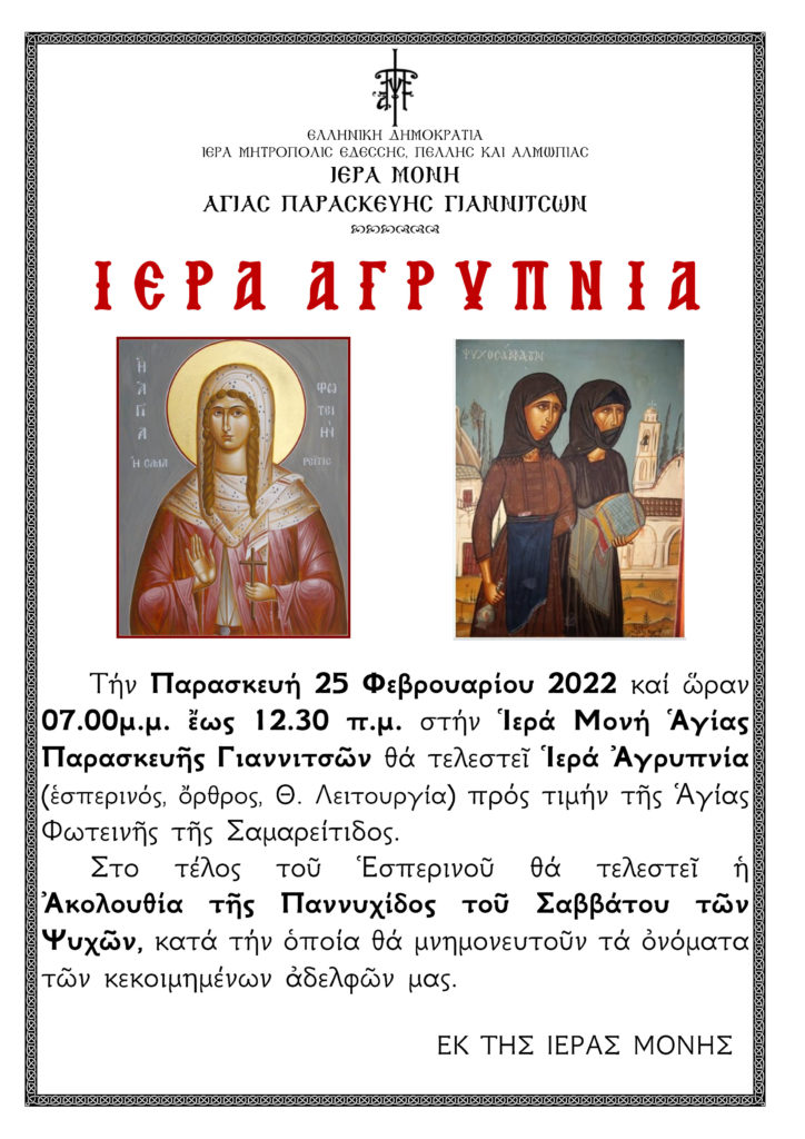 Στην Ιερά Μονή Αγίας Παρασκευής Γιαννιτσών θα τελεσθεί Ιερά Αγρυπνία (Εσπερινός, Όρθρος, Θ. Λειτουργία) εις τιμήν και μνήμην της Αγίας Φωτεινής της Σαμαρείτιδος, την Παρασκευή 25 Φεβρουαρίου 2022 από τις 7.00 μ.μ. έως τις 12.30 π.μ.