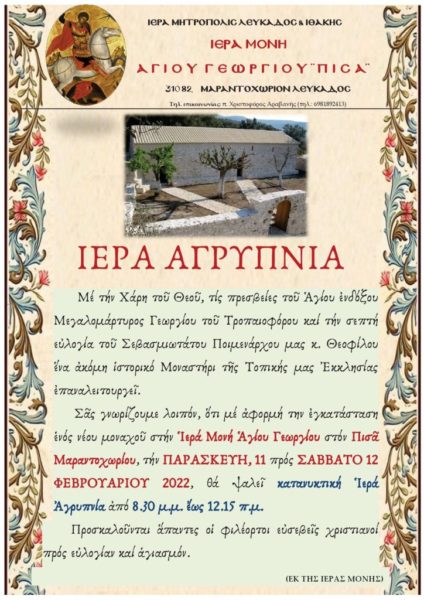 Με αφορμή την εγκατάσταση ενός νέου μοναχού στην Ιερά Μονή Αγίου Γεωργίου στον Πισά Μαραντοχωρίου, την Παρασκευή 11, προς Σάββατο 12 Φεβρουαρίου 2022, θα ψαλεί κατανυκτική Ιερά Αγρυπνία από 8.30 μ.μ. έως 12.15 π.μ.