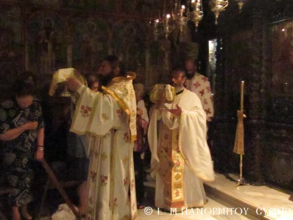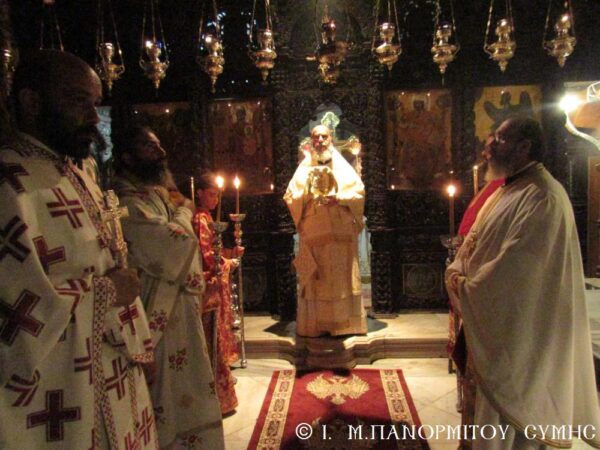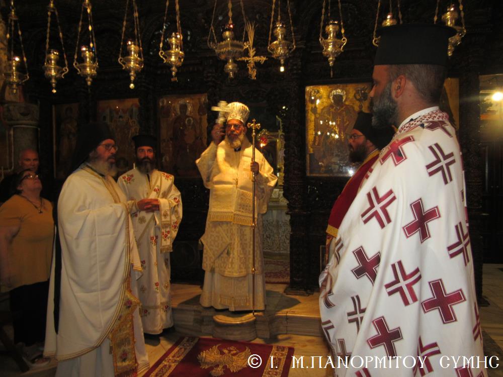 Ἐν συνεχείᾳ ἀκολούθησε ὁ Ὄρθρος στόν ὁποῖο χοροστάτησε ὁ Σεβ. Ποιμενάρχης κ. Χρυσόστομος, ὁ ὁποῖος τέλεσε καί τήν Θεία Λειτουργία μέ συλλειτουργούς του τόν Πανοσιολ. Καθηγούμενο τῆς Ἱ. Μονῆς Ἀρχιμ. π. Ἀντώνιο Πατρό, τόν Ἀρχιμ. Ἰωαννίκιο Ἀναγνώστου ἐκ τῆς Ἱ. Μητροπόλεως Ρόδου, τόν Αἰδεσ. Πρεσβύτερο π. Δημήτριο Γεωργιάδη, Ἐφημέριο τοῦ Ἁγ. Ἐλευθερίου Σύμης καί τόν Διάκονό του π. Γεώργιο Κακακιό, ἐνῶ πρό τῆς Ἀπολύσεως κήρυξε ἐμπνευσμένα τόν θεῖο λόγο. Πολλοί ἦσαν οἱ πιστοί ἐκείνοι, οἱ ὁποῖοι ἀξιοποιῶντας τήν πνευματική αὐτή εὐκαιρία προσῆλθαν στό Ποτήριο τῆς Ζωῆς.