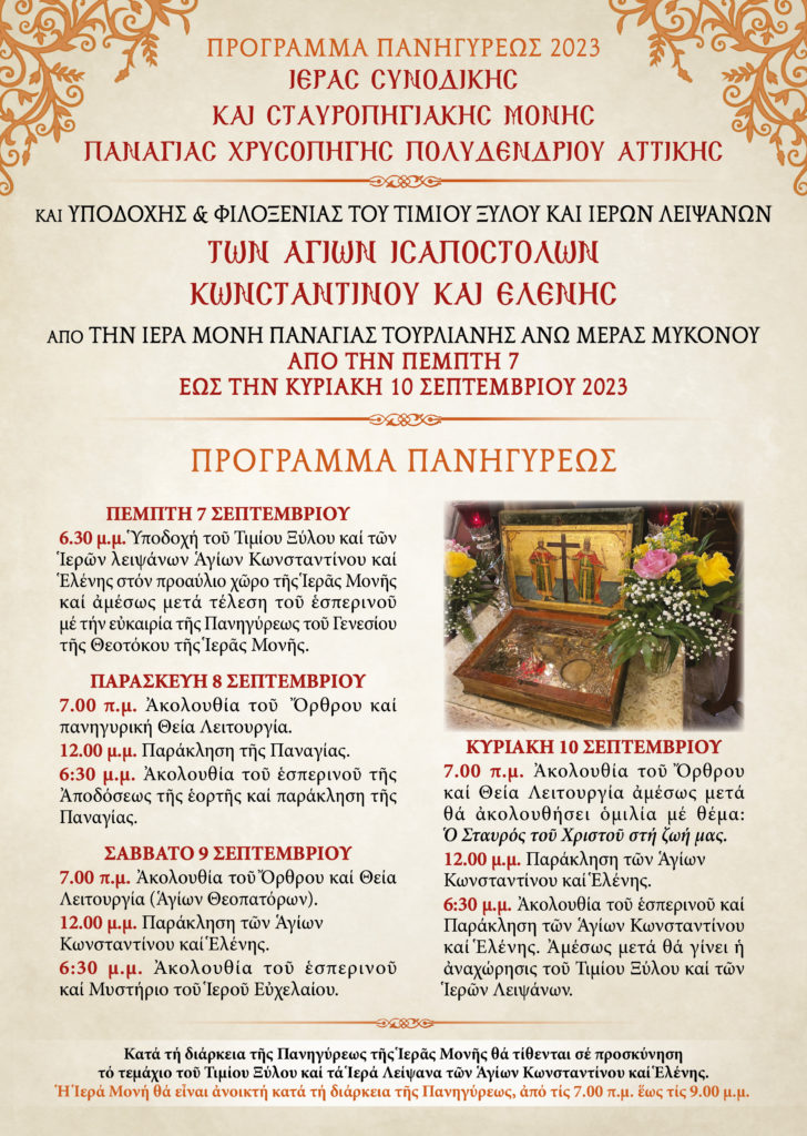 Με την ευκαιρία της Πανηγύρεως, φέτος η Ιερά Μονή θα υποδεχθεί και θα φιλοξενήσει από την Πέμπτη 7 έως και την Κυριακή 10 Σεπτεμβρίου Ιερά Λείψανα των Αγίων Θεοστέπτων Βασιλέων Κωνσταντίνου και Ελένης και τεμαχίου του Τιμίου Ξύλου από την Ιερά Μονή Παναγίας Τουρλιανής Άνω Μεράς Μυκόνου.