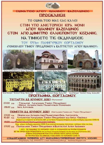 Ανακοινώθηκε το πρόγραμμα του πανηγυρικού εορτασμού της Ιεράς Μονής Βαζελώνος, που τιμά το γενέθλιον του προστάτη της Τιμίου Προδρόμου και βαπτιστού Ιωάννου.