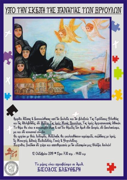 Ημερίδα αγάπης υπό την ευλογία και τη φιλοξενία της Γερόντισσας Φιλοθέης και της Αδελφότητος στο Μετόχι της Ιεράς Μονής Βρυούλων της Ιεράς Αρχιεπισκοπής Αθηνών. Το θέμα θα είναι η συνύπαρξη όλων και επί του θέματος των ΑΜΕΑ στην Ενορία, στο Εκκλησίασμα και στο κοινωνικό σύνολο.