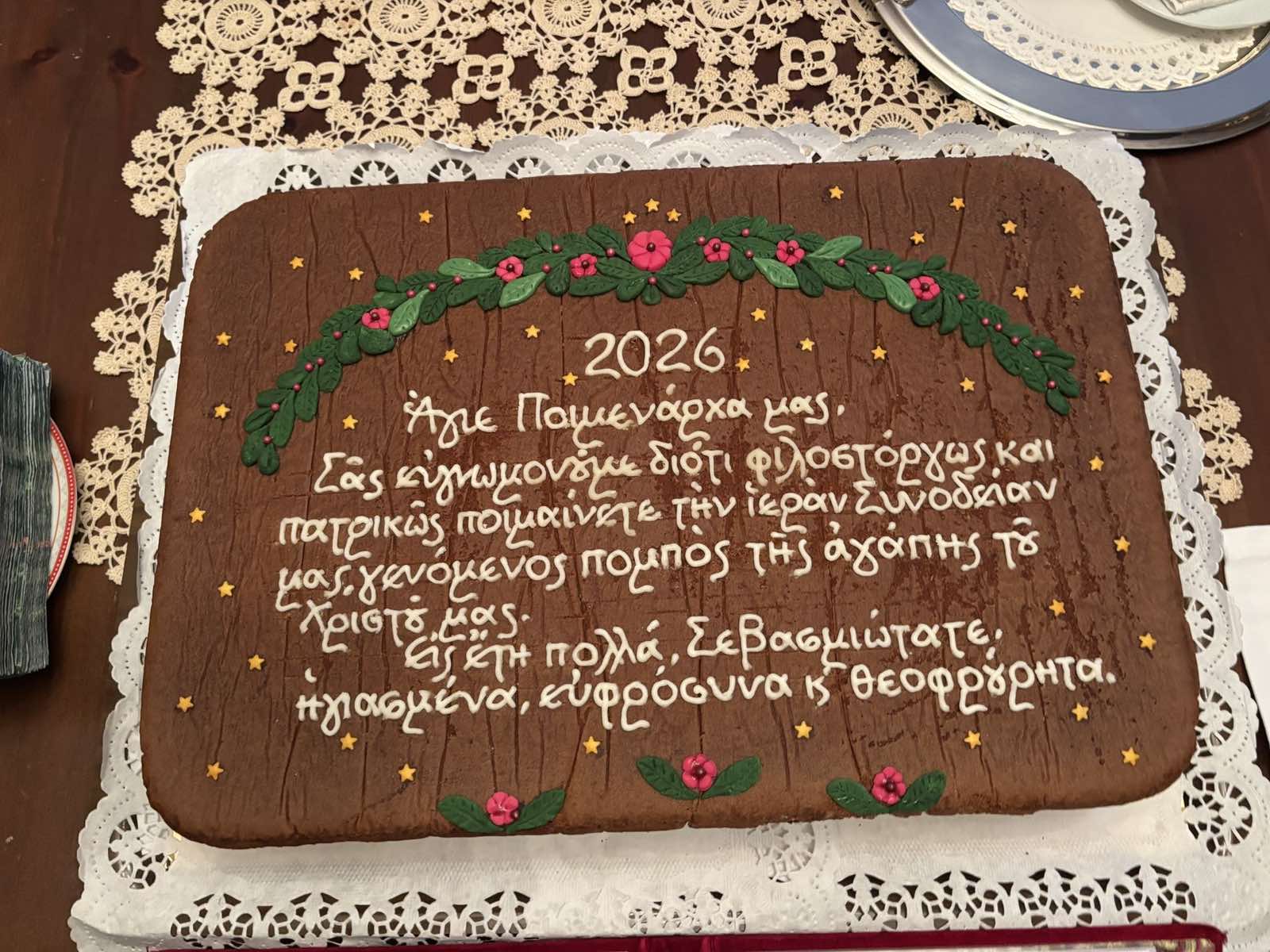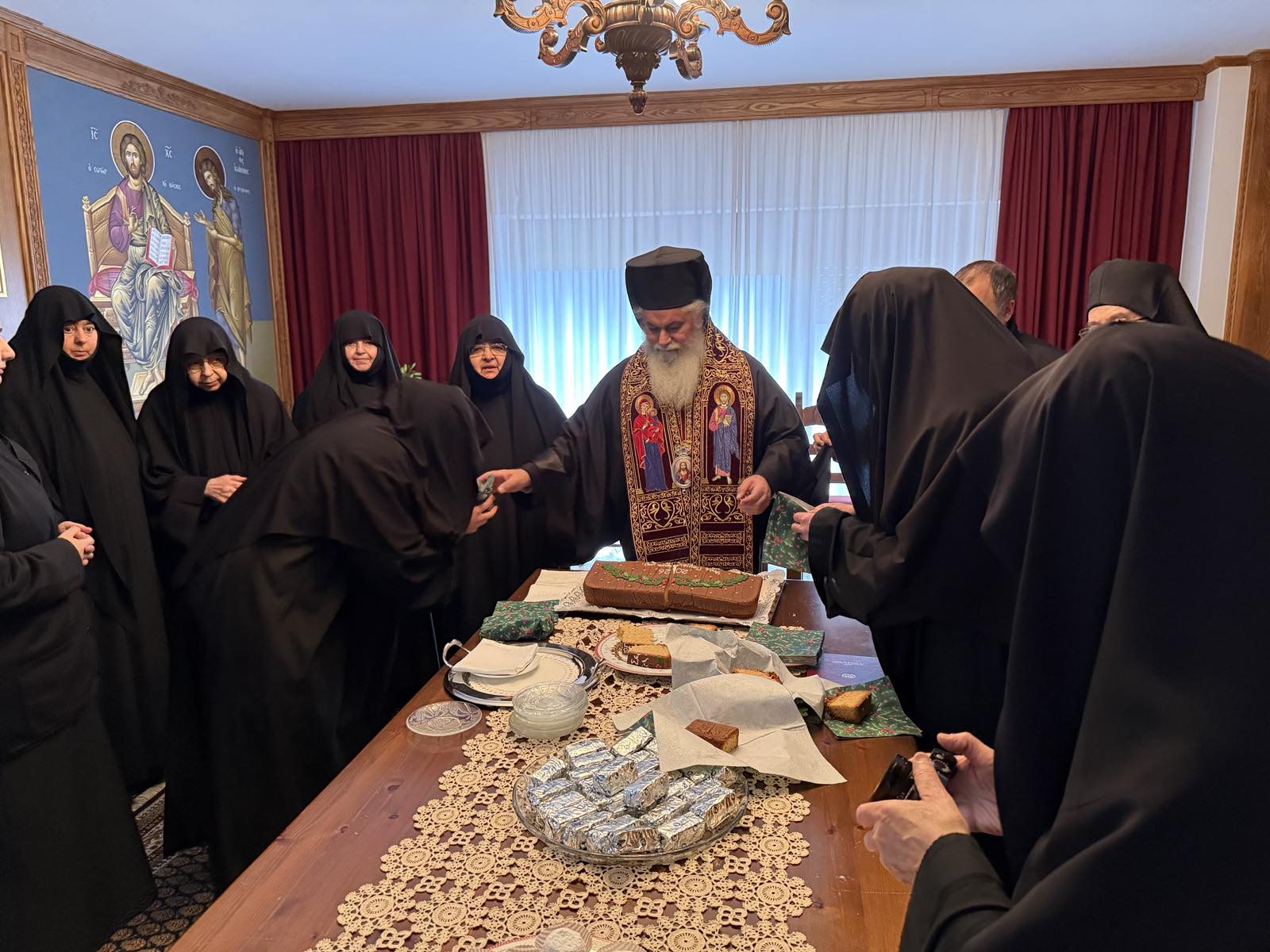 Η Οσιωτάτη Ηγουμένη και οι Μοναχές της Αδελφότητος αντευχήθηκαν προς τον Σεβασμιώτατο, εκφράζοντας με βαθύ σεβασμό και αγάπη την ευγνωμοσύνη τους για τη διαρκή ποιμαντική του φροντίδα, την πατρική του στοργή και την αμέριστη συμπαράστασή του στο πνευματικό τους έργο, δεόμενες υπέρ μακροημερεύσεως και καρποφόρου εξακολουθήσεως της θεοφρουρήτου ποιμαντορίας του Σεβασμιωτάτου Μητροπολίτου κ. Ιερωνύμου.