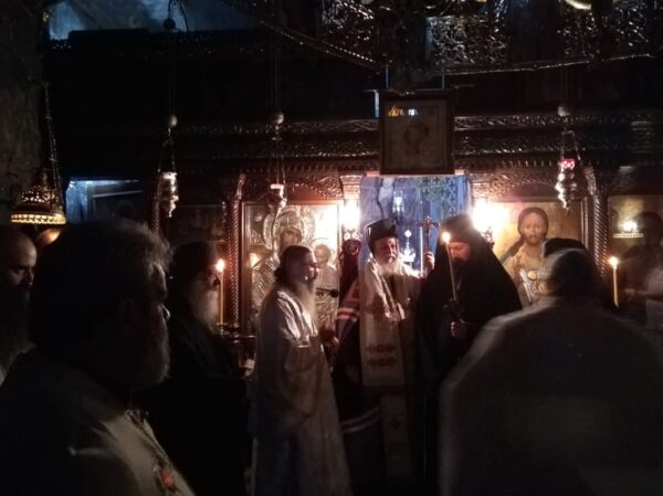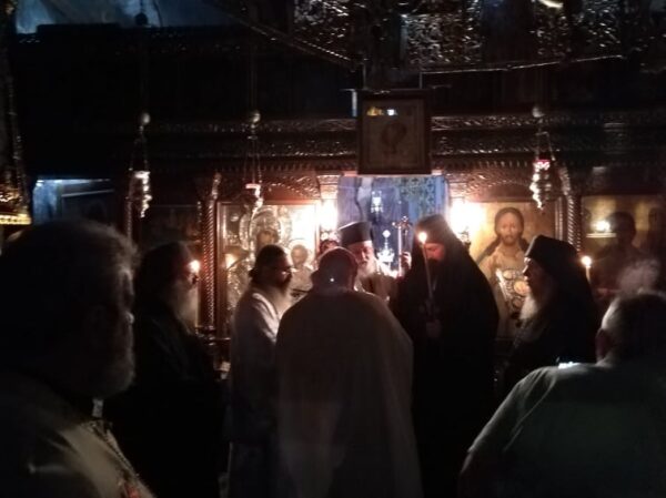 Προηγήθηκε η Ακολουθία του Εσπερινού, στην οποία έλαβαν μέρος, εκτός του Ηγουμένου της Μονής Αρχιμανδρίτου Νεκταρίου, ο Ηγούμενος της Ι. Μονής Αιμυαλών Αρκαδίας Αρχιμανδρίτης Δαμασκηνός και άλλοι Αρχιμανδρίτες, Ιερομόναχοι και Κληρικοί της Μητροπόλεως.