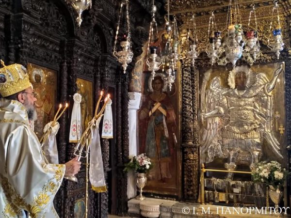 Την Κυριακή του Παραλύτου, 23η Μαΐου και 238η επέτειος των εγκαινίων του Καθολικού της Ιεράς Μονής Πανορμίτου, ο Σεβ. Μητροπολίτης Σύμης, Τήλου, Χάλκης και Καστελλορίζου κ. Χρυσόστομος χοροστάτησε στον Όρθρο και τέλεσε την Θ. Λειτουργία στο Αρχαγγελικό αυτό Θυσιαστήριο, με συλλειτουργούς του τον Πανοσιολ. Καθηγούμενο π. Αντώνιο και τους Διακόνους μας π. Σεραφείμ Βιολάκη και π. Γεώργιο Κακακιό. Το αναλόγιο διακόνησαν σεμνοπρεπώς ο Πρωτοψάλτης της Μονής κ. Μερκούριος Γιανναράς, μετά του κ. Μιχαήλ Κυπριώτη, ενώ, πέραν των ευαρίθμων πιστών, λίαν τιμητική ήταν και η συμμετοχή του Δημάρχου Σύμης κ. Ελευθερίου Παπακαλοδούκα.