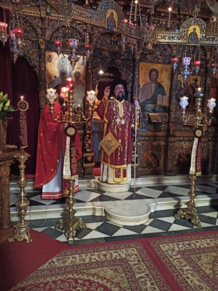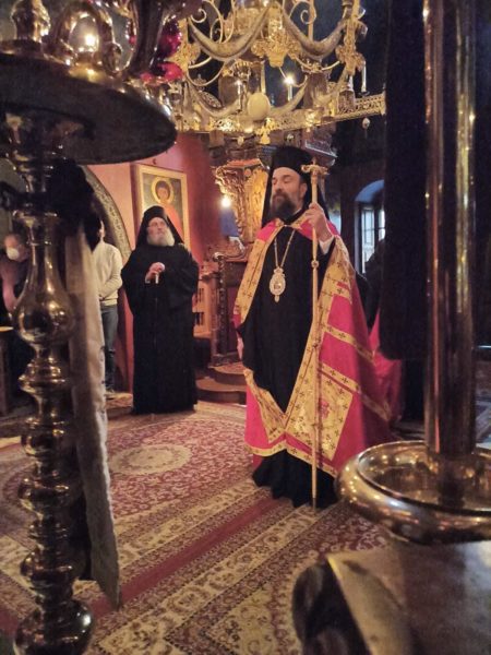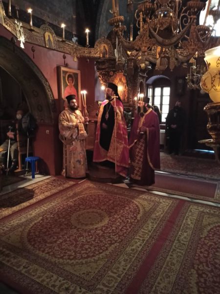Ο καθηγούμενος της Ιεράς Μονής π. Δαμασκηνός Γαβαλάς καλωσόρισε τον Σεβασμιώτατο και πάλι στην Μονή, όπου σήμερα μετά από αρκετές προηγούμενες επισκέψεις τέλεσε για πρώτη φορά την Θεία Λειτουργία.