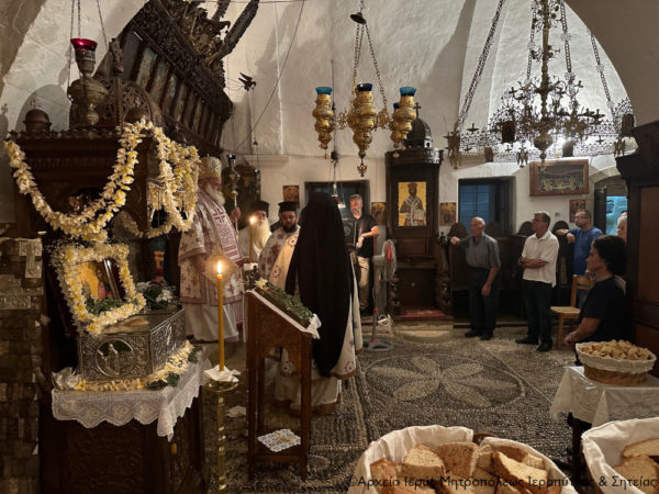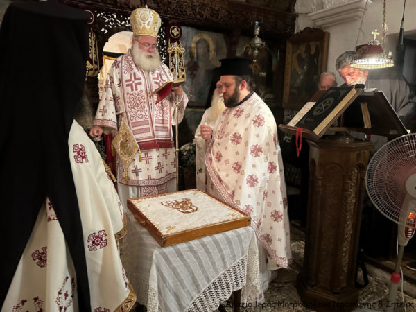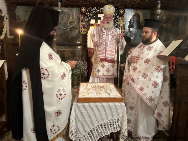 Στη συνέχεια ο Σεβασμιώτατος κ. Κύριλλος χοροστάτησε κατά την Ακολουθία του Όρθρου και τέλεσε εντός του Καθολικού την Αρχιερατική Θεία Λειτουργία, ενώ στο τέλος ευλόγησε το κόλλυβο του αγίου και μίλησε κατάλληλα.