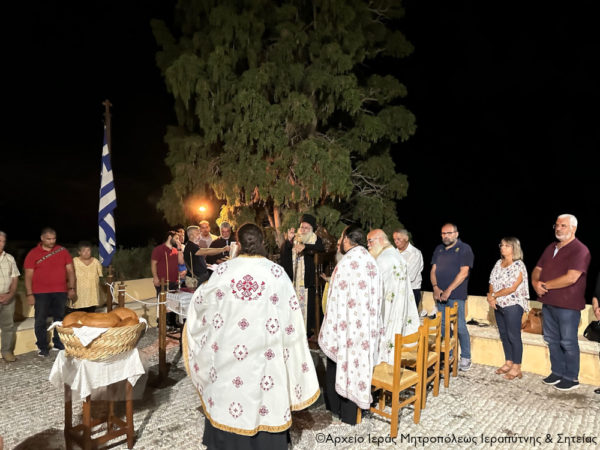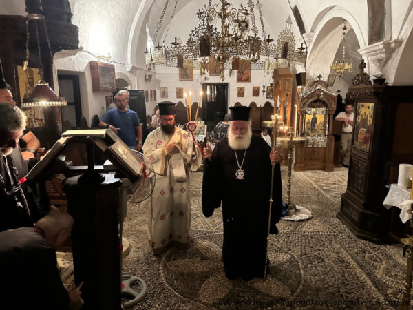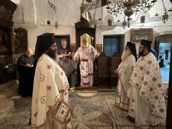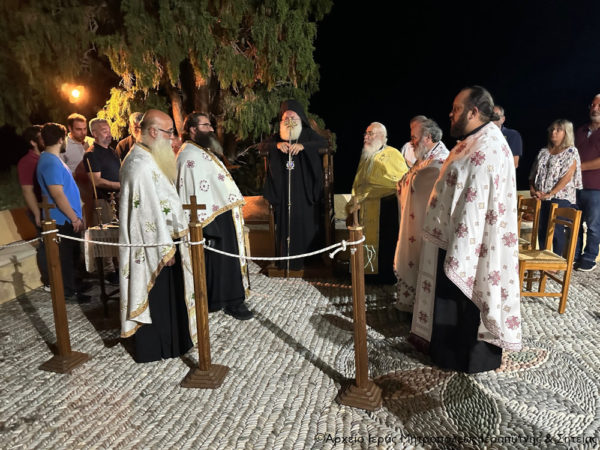 Στη συνέχεια τελέσθηκε η Ακολουθία του Μεγάλου Εσπερινού και της Λιτής στο προαύλιο του Καθολικού της Μονής, όπου ο Σεβασμιώτατος Μητροπολίτης Ιεραπύτνης και Σητείας κ. Kύριλλος χοροστάτησε κατά την αγιορειτική τάξη και ευλόγησε τους προσφερόμενους άρτους.