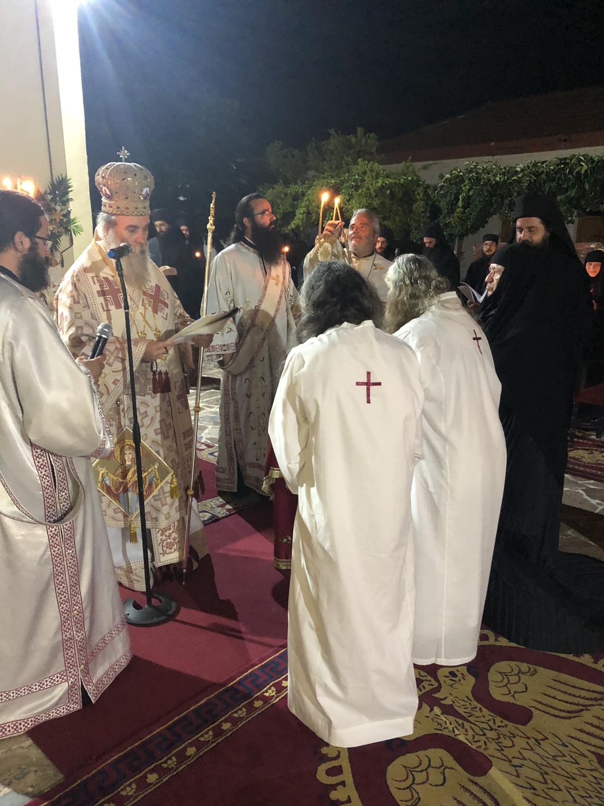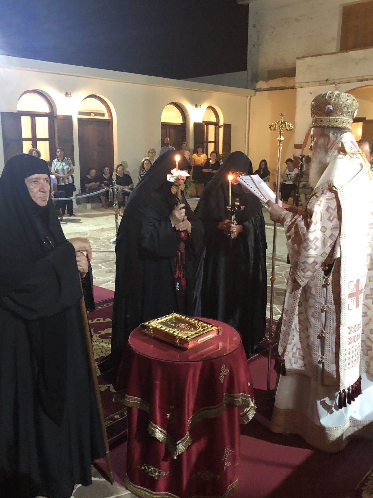 Κατά την Ιερά Αγρυπνία χειροθετήθηκαν, υπό του Σεβ. Ποιμενάρχου κ. Αμφιλοχίου, σε μεγαλόσχημες δύο εκ των Αδελφών της Μονής. Η μία αδελφή μετονομασθείσα Θεοσέμνη και η έτερη Μακρίνα. Δανειζόμενος τους λόγους του αγίου Γέροντος Σιλουανού του Αγιορείτου ο λειτουργών Ιεράρχης σημείωσε: «Η μοναστική πολιτεία έχει ως στόχο και πόθο την ένωση με τον Θεό. Η Μονή είναι πολιτεία αγιαζομένων όπου ανυψώνει τον άνθρωπο και τον κάνει, κατά χάριν, κοινωνό της Θεότητας. Ο μοναχός μέσα από τον έμπονο πνευματικό του αγώνα, την άσκηση, την υπακοή, την ταπείνωση και την εκοπή του ιδίου θελήματος, μεταμορφώνεται «μεμυσταγωγημένος» και «θεοφορούμενος», όπως σημειώνει και ο Μ. Αθανάσιος», ανέφερε ο Σεβ. Μητροπολίτης Κισάμου και Σελίνου κ. Αμφιλόχιος.