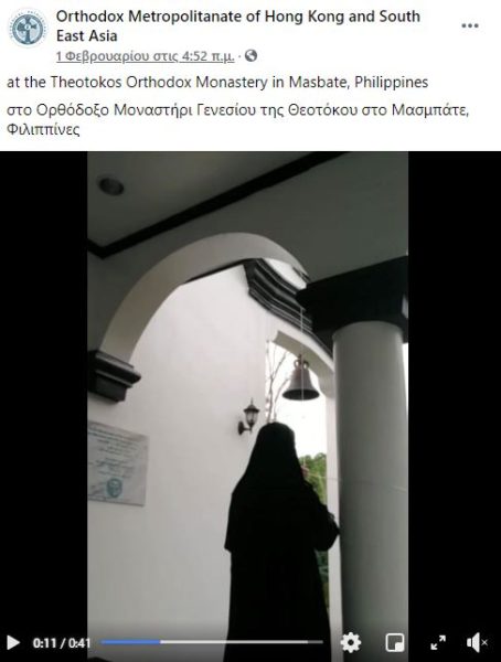 Πριν λίγες ημέρες, στο Ορθόδοξο Μοναστήρι Γενεσίου της Θεοτόκου στο Μασμπάτε, Φιλιππίνες, μία Ορθόδοξη μοναχή σημαίνη την καμπάνα της μοναστικής μάνδρας. Η Ορθοδοξία στην Νοτιοανατολική Ασία κάμει αργά και σταθερά βήματα για τη διάδοση και την στερέωση του ορθοδόξου χριστιανικού φρονήματος, επιτυγχάνοντας σιγά σιγά να κερδίζει τις καρδιές των ντόπιων, οι οποίοι διαισθάνονται ότι κάτι το διαφορετικό, αληθινό και γνήσιο εξ ύψους υπάρχει στις παραδόσεις της ορθοδόξου λατρείας.