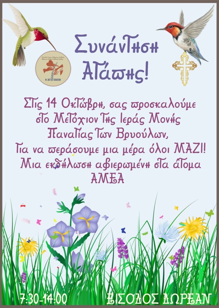Μια συνάντηση αγάπης αφιερωμένη στα άτομα ΑμΕΑ πραγματοποιείται το Σάββατο 14 Οκτωβρίου, από 7.30 το πρωί έως 14.00, στο Μετόχι της Ιεράς Μονής Παναγία των Βρυούλων στον Ωρωπό.