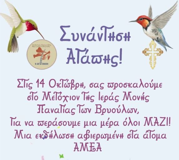 Μια συνάντηση αγάπης αφιερωμένη στα άτομα ΑμΕΑ πραγματοποιείται το Σάββατο 14 Οκτωβρίου, από 7.30 το πρωί έως 14.00, στο Μετόχι της Ιεράς Μονής Παναγία των Βρυούλων στον Ωρωπό.