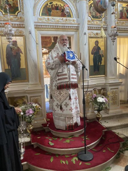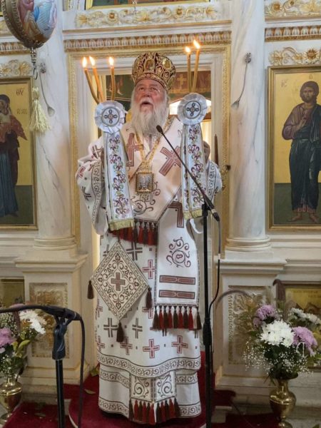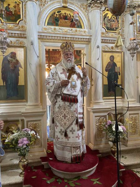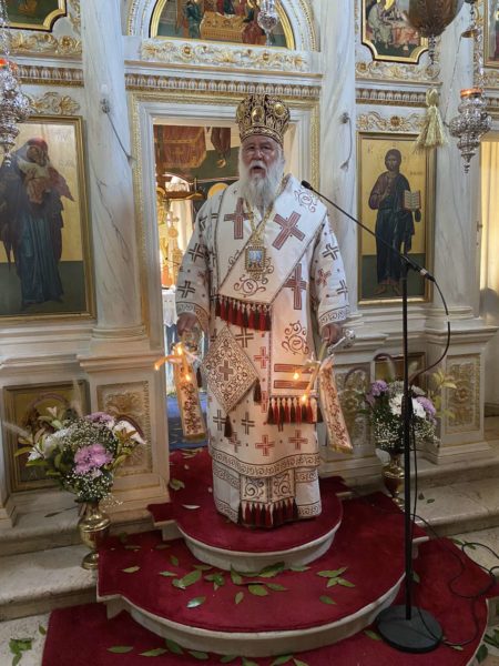 Κατά την Θεία Λειτουργία, ο Σεβασμιώτατος αναφέρθηκε στο γεγονός της Θείας Μεταμορφώσεως, ο οποίος υπογράμμισε ότι στην παρούσα εορτή δεν έχουμε μόνον πρωταγωνιστή τον Τριαδικό Θεό, αλλά έχουμε και ανθρώπους κοντά Του, που σηματοδοτούν το πέρασμα από την Παλαιά στην Καινή Διαθήκη, από την περίοδο του Νόμου, στην περίοδο της Θείας Χάριτος. Ο Μωυσής και ο Ηλίας, εκπρόσωποι των κεκοιμημένων και των ζώντων, εκπρόσωποι του Νόμου και των Προφητών, που αξιώθηκαν να συνομιλήσουν με τον Θεό «ενώπιος ενωπίω» στην Παλαιά Διαθήκη από την μια μεριά, και οι τρείς εκ των προκρίτων μαθητών, ο Πέτρος, ο Ιάκωβος και ο Ιωάννης, εκπρόσωποι της ανθρωπότητας που ζει την Θεία χάρη της Καινής Διαθήκης από την άλλη πλευρά. Αυτοί μας δείχνουν ότι κληθήκαμε να συνομιλήσουμε με τον Θεό. Μας δείχνουν ότι η πορεία της ζωής μας δεν είναι να μένουμε στα παρόντα, στα βιοτικά, στις ηδονές και στις οδύνες της ζωής μας, αλλά να ζήσουμε μεταμορφωμένοι με τον Κύριο μας σε μια οντολογική σχέση, η οποία είναι η ανώτατη θέση του ανθρώπου που δημιουργήθηκε από τον Θεό. Ο Μωυσής που κλήθηκε από τον Θεό δύο φορές για να οδηγήσει τον ηγαπημένο Του λαό στην ελευθερία από την δουλεία, αφενός μεν του αποκαλύφθηκε στο Σινά, στην καιομένη βάτο, και του συστήθηκε λέγοντας Του ότι «εγώ ειμί ο Ων», και ξανά οδηγώντας τον λαό στο ίδιο σημείο του Σινά, καλείται από τον Θεό να λάβει το Νόμο και να ατενίσει την δόξα Του, με κεκαλυμμένη την κεφαλή, διότι την δόξα του Θεού, δεν θα μπορούσε να την αντέξει με ακάλυπτη την κεφαλή του. Και όταν κατεβαίνει κρατώντας τον Νόμο του Θεού συνεχίζει να φέρει το κάλυμμα επί της κεφαλής διότι αυτή η δόξα του Θεού, ήταν αποτυπωμένη στο πρόσωπο του. Και ο Προφήτης Ηλίας στο διπλανό όρος, Χωρίβ, κλήθηκε από τον Θεό μετά από τις διώξεις και τις ταπεινώσεις από τους ειδωλολάτρες βασιλείς, να γνωρίσει τον Θεό και εκεί τον γνώρισε ως λεπτή αύρα που δροσίζει και αγιάζει. Και τούτο διότι η φωνή του Θεού είναι η φωνή που λυτρώνει τον προφήτη από την μοναξιά, από την κόπωση και την απόγνωση. Δείχνει δηλαδή ο Θεός στον άνθρωπο ότι τον έπλασε για να είναι μαζί του, και να κοινωνεί την αγάπη του Θεού και την αιωνιότητα. Καθώς και ότι ο θάνατος του κακού, της μοναξιάς, της λύπης, δεν υπάρχει σ αυτόν που ζει την παρουσία του Θεού. Στην εορτή της Μεταμορφώσεως οι δύο πρωταγωνιστές της Παλαιάς Διαθήκης θα συναντηθούν με τους τρεις μαθητές, μόνο που τώρα η κοινωνία Θεού και ανθρώπων δεν είναι κεκαλυμμένου προσώπου.