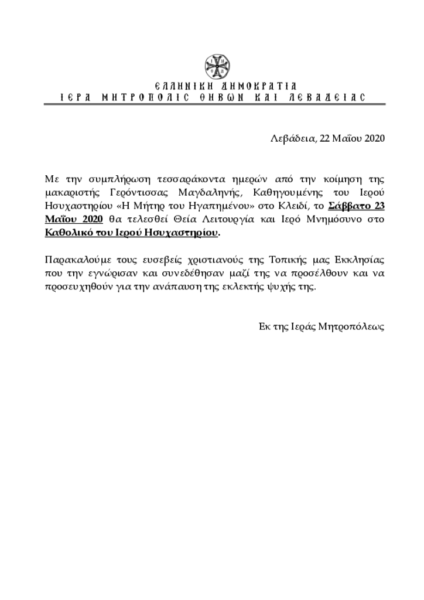 Το μνημόσυνο της μακαριστής Γερόντισσας Μαγδαληνής, καθηγουμένης του Ιερού Ησυχαστηρίου “Η Μήτηρ του Ηγαπημένου” στο Κλειδί, για τις 40 ημέρες από την κοίμησή της θα τελεστεί αύριο, Σάββατο 23 Μαΐου 2020, στο Καθολικό του Ιερού Ησυχαστηρίου όπως ανακοίνωσε η Ιερά Μητρόπολη Θηβών και Λεβαδείας.