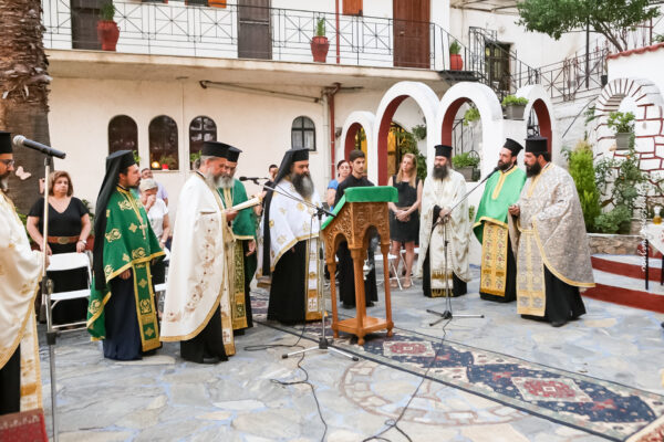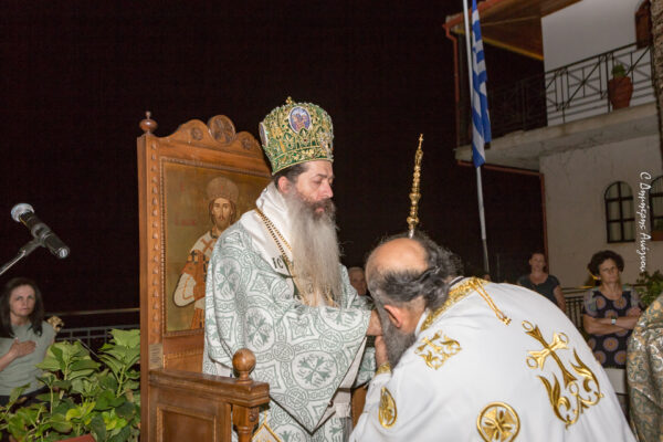 «Με το παράδειγμα της ζωής σας, Σεβασμιώτατε, με την αρχιερατική σας ευλογία και το ακούραστο εκκλησιαστικό σας φρόνημα, μας δίδετε το χνάρι της μεταμορφωτικής δυνατότητας που υπάρχει μέσα στην Εκκλησία. Ένα βαπτιστήριο αυτής της μεταμορφωτικής δυνατότητας είναι τα Μοναστήρια μας. Γι’ αυτό λοιπόν ευλογήστε αυτό εδώ τον Ιερό τόπο, που με συγκίνηση σας παρακολουθήσαμε να ευλογείτε από εδώ ψηλά την θάλασσα, την στεριά και όλες τις πόλεις και τα χωριά της Μητροπολιτικής μας Επαρχίας. Σας ευχόμαστε έτη πολλά, ευλογημένα και ο Καρδιογνώστης Κύριος να σας αποδίδει χιλιοπλάσια τους αρχιερατικούς κόπους και αγώνες σας», ανέφερε χαρακτηριστικά ο π. Άγγελος.