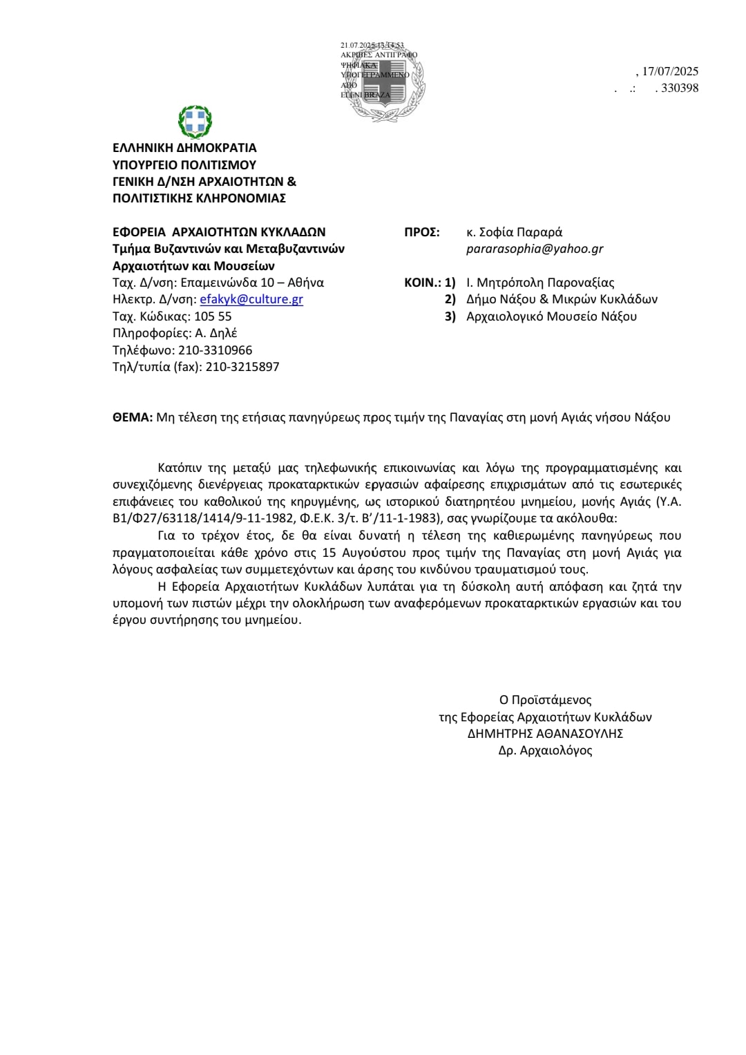 Η Εφορεία Αρχαιοτήτων Κυκλάδων ζητά την κατανόηση και υπομονή των πιστών, υπογραμμίζοντας πως η απόφαση πάρθηκε με σεβασμό στο μνημείο και στους προσκυνητές, αλλά και με βασικό γνώμονα την αποτροπή οποιουδήποτε κινδύνου για τη σωματική ακεραιότητα των συμμετεχόντων.