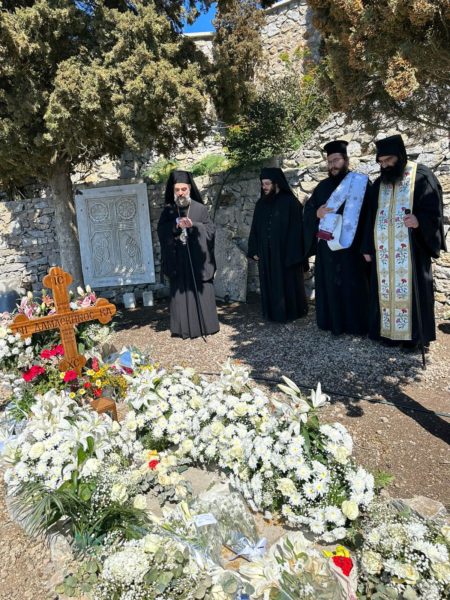 Στην συνέχεια ο Σεβασμιώτατος και η αδελφότητα μετέβησαν στον τάφο του μακαριστού Καθηγουμένου π. Δαμασκηνού Γαβαλά στο κοιμητήριο της Ιεράς Μονής, όπου ο π. Καλλίνικος τέλεσε τρισάγιο για την ανάπαυση της ψυχής του προκατόχου του.