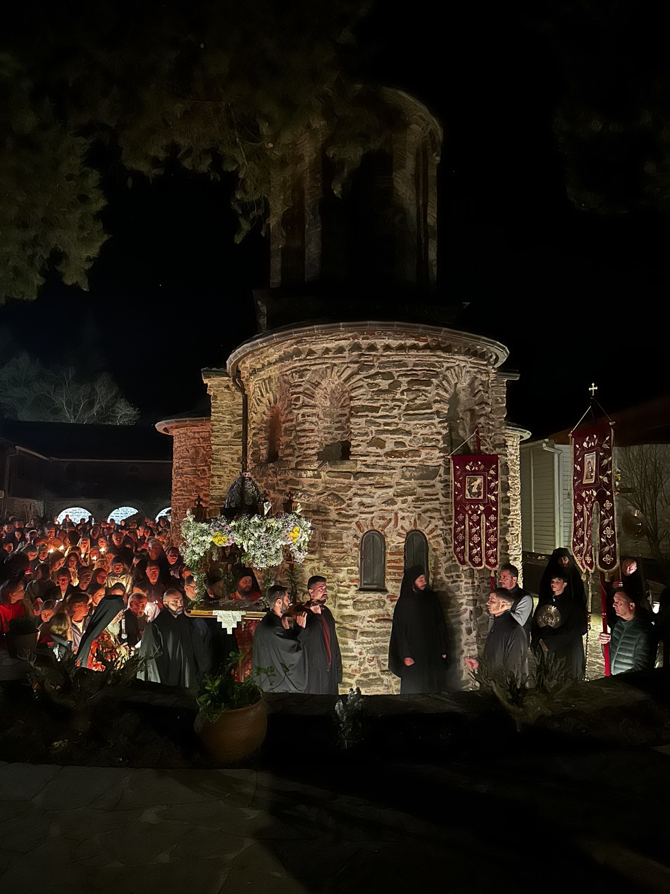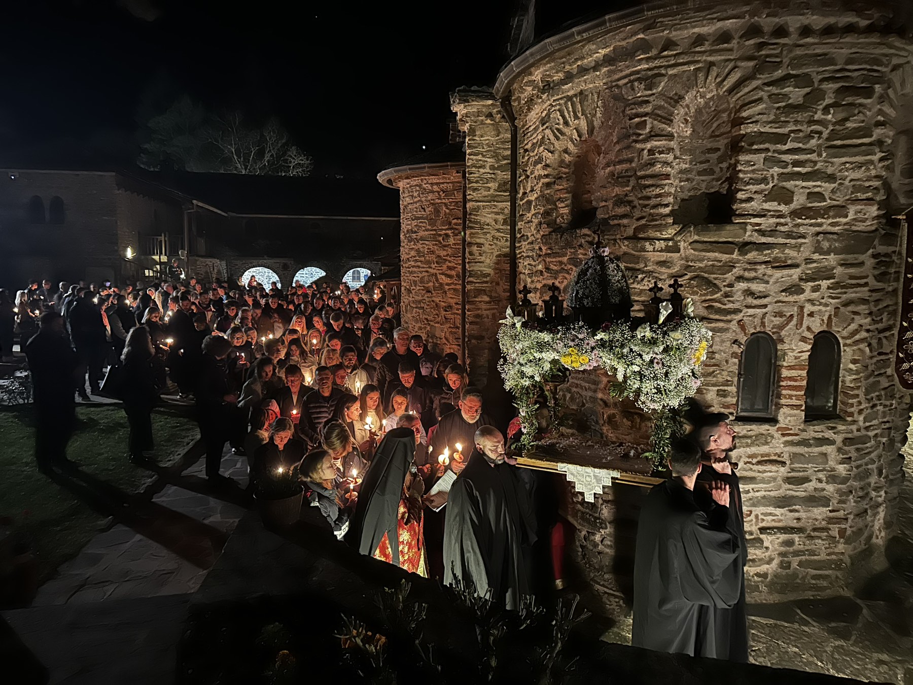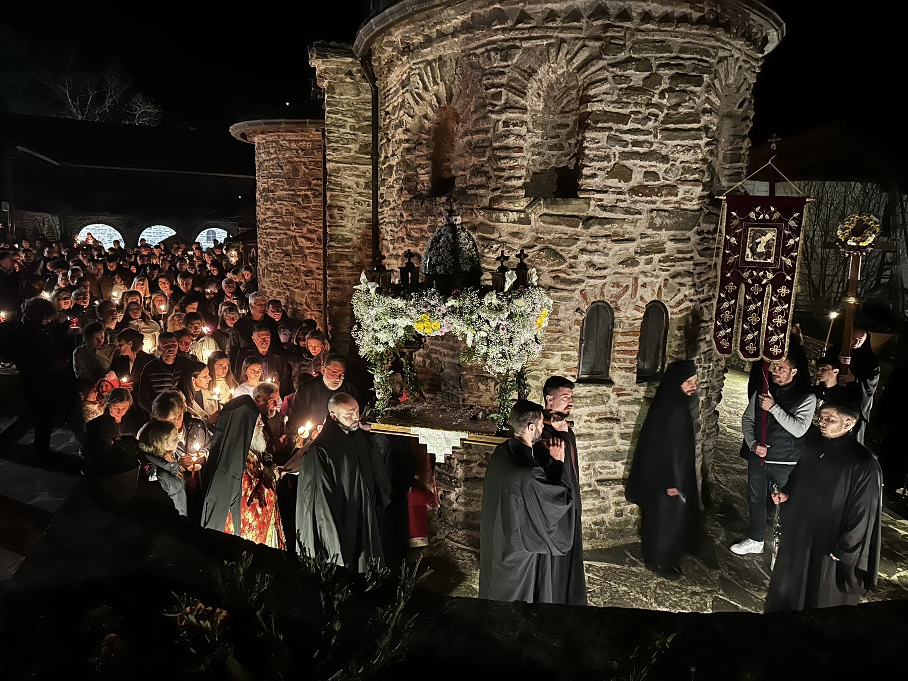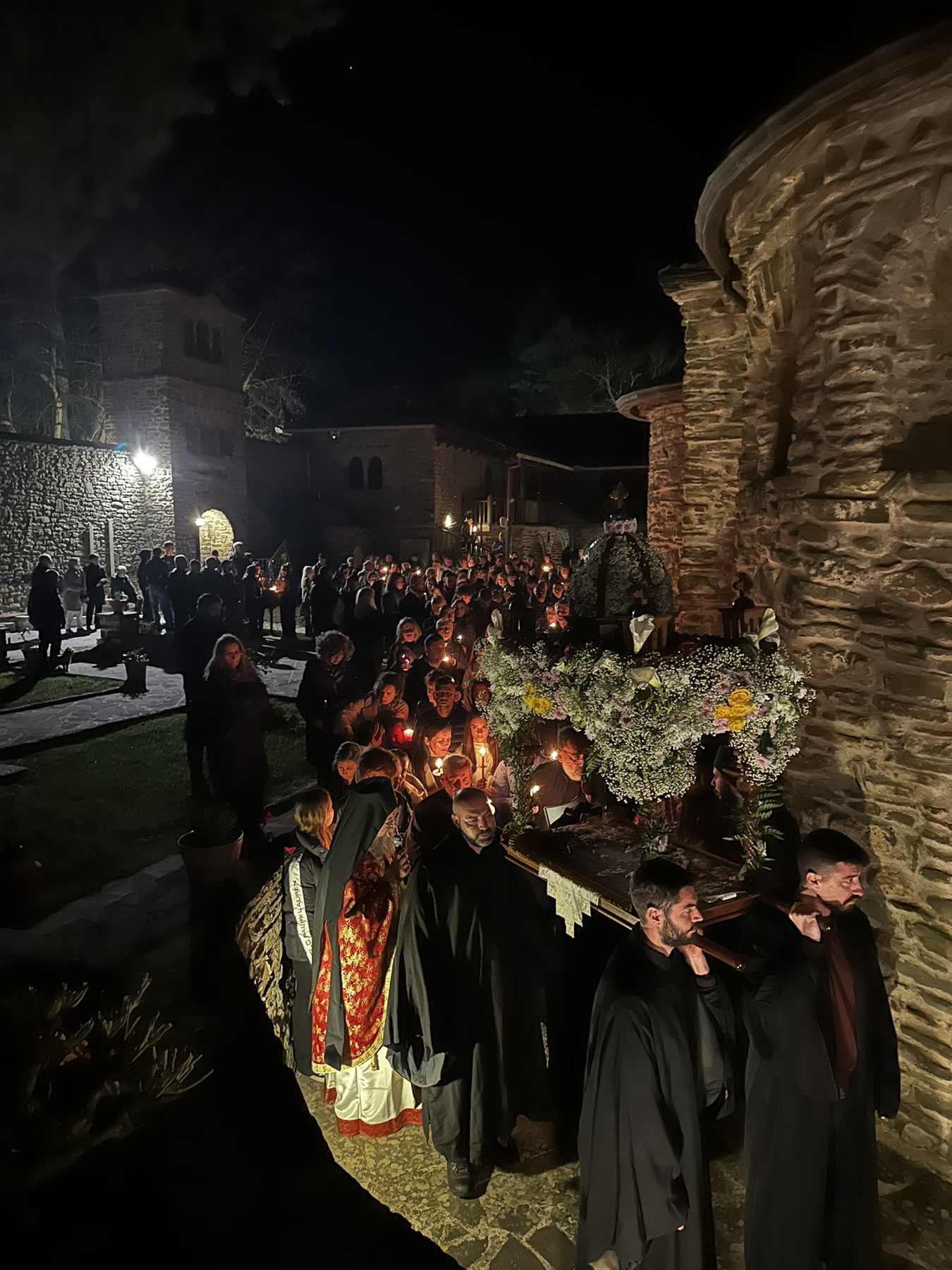 Οι κώδωνες της Μονής ηχούσαν πενθίμως, προσκαλούντας τους πιστούς εις προσευχή και περισυλλογή. Το εσπέρας ετελέσθη, με εκκλησιαστική ευπρέπεια, η Ακολουθία του Επιταφίου Θρήνου, καθ’ ην οι ιεροί ύμνοι της Εκκλησίας ανέδειξαν με θεολογικό βάθος το μυστήριο της Θείας Κενώσεως και της εκουσίας Ταφής του Κυρίου ημών Ιησού Χριστού.