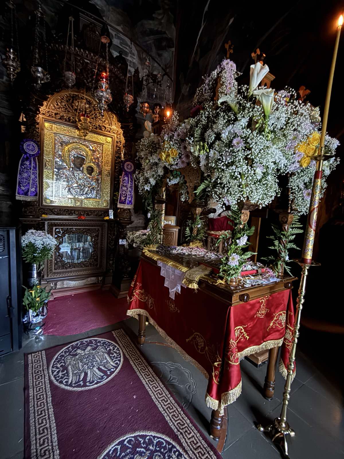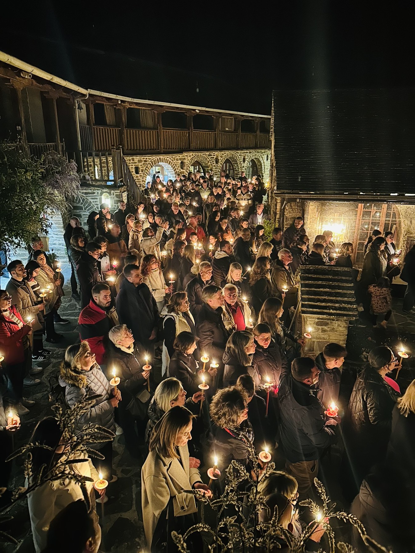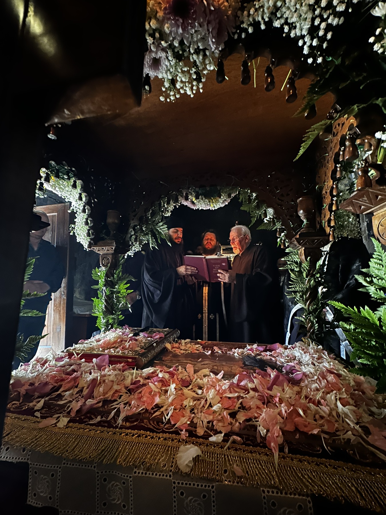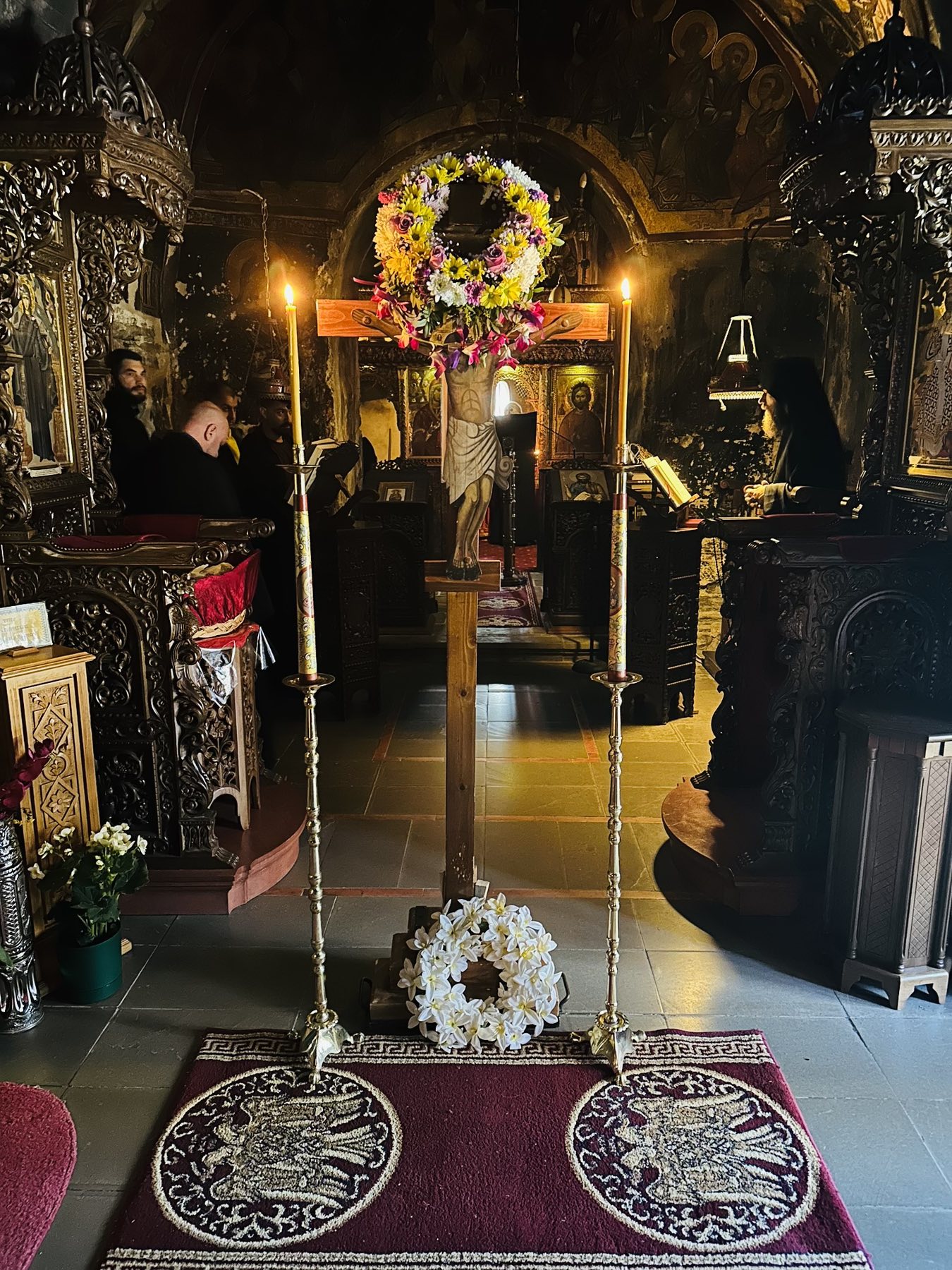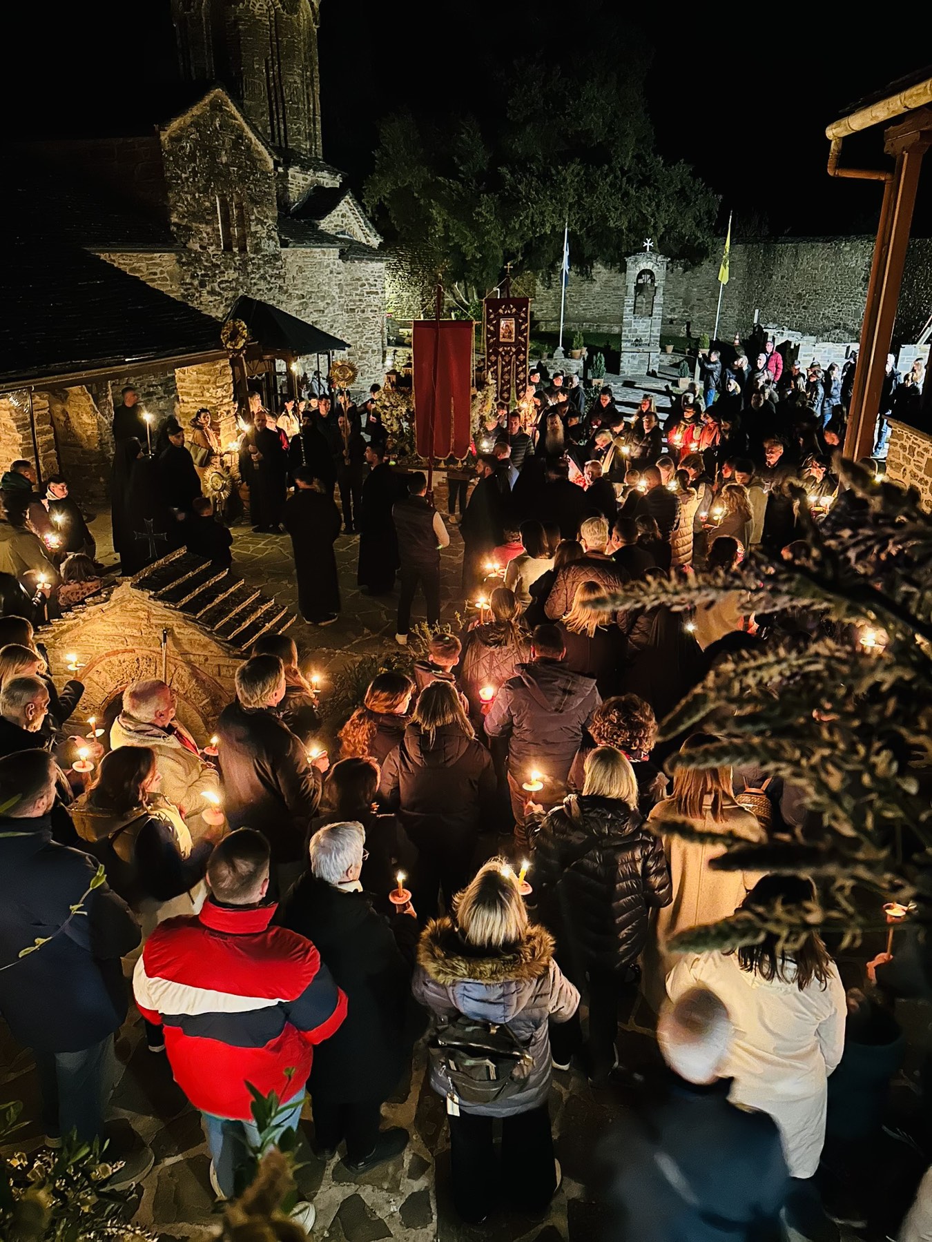 Οι κώδωνες της Μονής ηχούσαν πενθίμως, προσκαλούντας τους πιστούς εις προσευχή και περισυλλογή. Το εσπέρας ετελέσθη, με εκκλησιαστική ευπρέπεια, η Ακολουθία του Επιταφίου Θρήνου, καθ’ ην οι ιεροί ύμνοι της Εκκλησίας ανέδειξαν με θεολογικό βάθος το μυστήριο της Θείας Κενώσεως και της εκουσίας Ταφής του Κυρίου ημών Ιησού Χριστού.