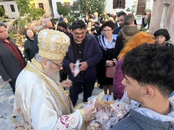 Προ της Απολύσεως ο Πρωτοσύγκελλος ανέγνωσε το Πασχάλιο Μήνυμα του Σεβασμιωτάτου Ποιμενάρχου και εν συνεχεία ο Σεβασμιώτατος διένειμε σε όλους τα πατροπαράδοτα κόκκινα αυγά, μεταφέροντας προς όλους τις Πασχάλιες Εόρτιες ευχές του.
